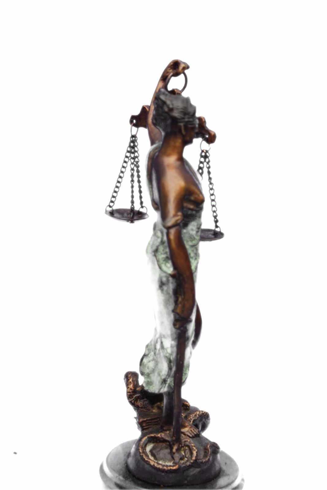 Lady Justice and Blind Justice are the names associated with the feminine image Them is, the goddess of Greek Mythology epitomizing the virtue of Justice. She holds the Sword of Truth in one hand to represent power and lifts her scales in the other, displaying impartiality. She is blindfolded to assure fairness in judgment, which calls to the old sacred ideals of law practices. She stands barefoot on the book of law, while a snake coils at her feet. She is a brown patina but her dress is a light green and. This would make a great inspiring gift for lawyers, judges, anyone who aspires to work in law. 100% bronze and handmade, this sculpture was cast using the Lost Wax Method. Bronze Dimensions with Marble Base: Height 10 X Width 6 inches. Weight: 5 LBS. Inventory: 1454019M41
