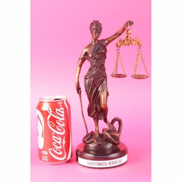Lady Justice and blind justice are the names associated with the feminine image them is, the goddess of Greek Mythology epitomizing the virtue of justice. She holds the Sword of Truth in one hand to represent power and lifts her scales in the other, displaying impartiality. She is blindfolded to assure fairness in judgment, which calls to the old sacred ideals of law practices. She stands barefoot on the book of law, while a snake coils at her feet. She is a brown patina but her dress is a light green and. Bronze dimensions with marble base: Height 10 X Width 6 inches. Weight: 5 lbs. Please Note: This is a reproduced bronze sculpture from the original molded and signed. This featured bronze sculpture is a recast after the original, and has been done recently. This 100% bronze sculpture is an abstract piece certain to be a conversation piece.