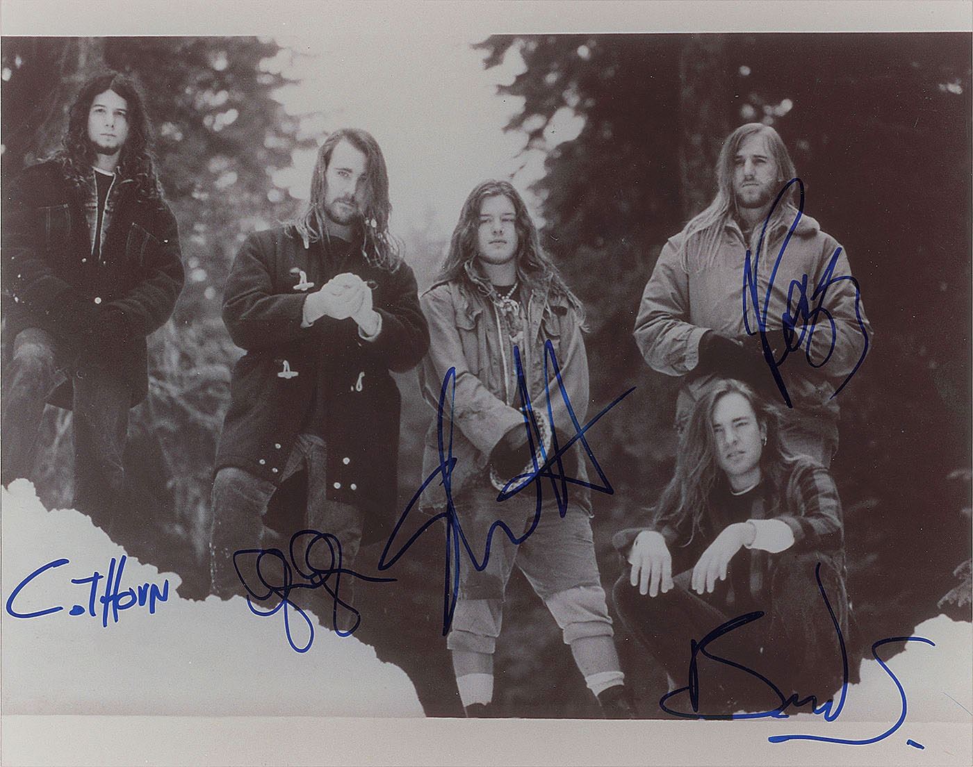 Glossy 14 x 11 band photo of Blind Melon posing outdoors during the winter, signed in blue felt tip by Shannon Hoon, Brad Smith, Rogers Stevens, Christopher Thorn, and Glenn Graham. In fine condition.