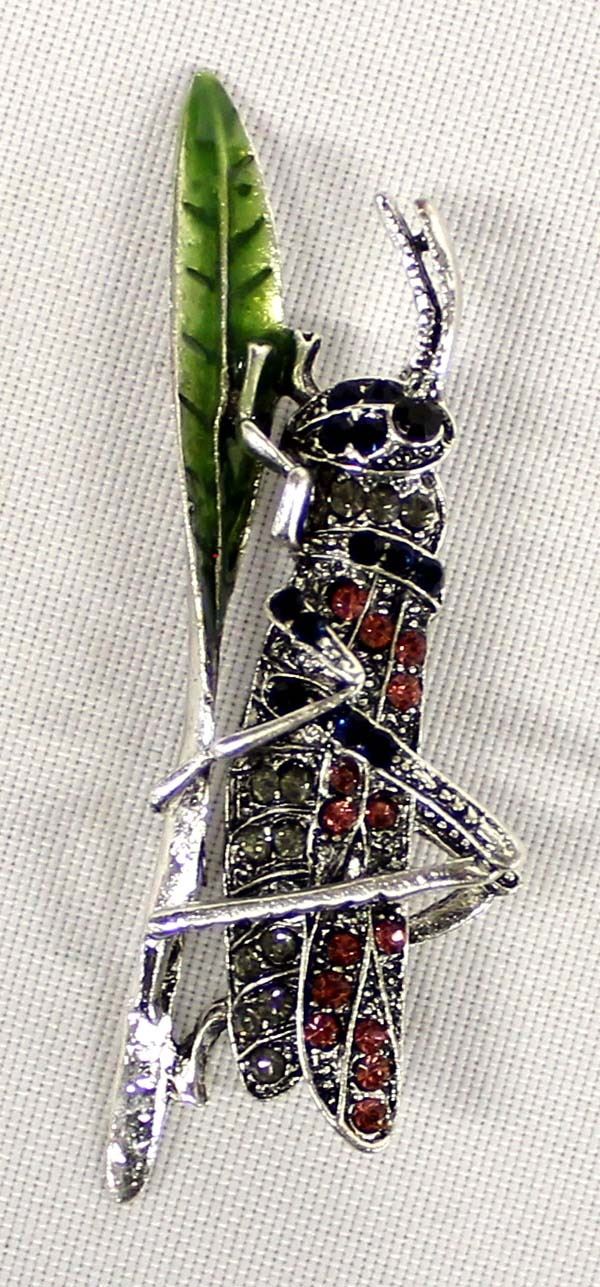 Bling Bling Rhinestone Grasshopper Sitting Atop a Leaf Pin, measures 2.75'' x 1''