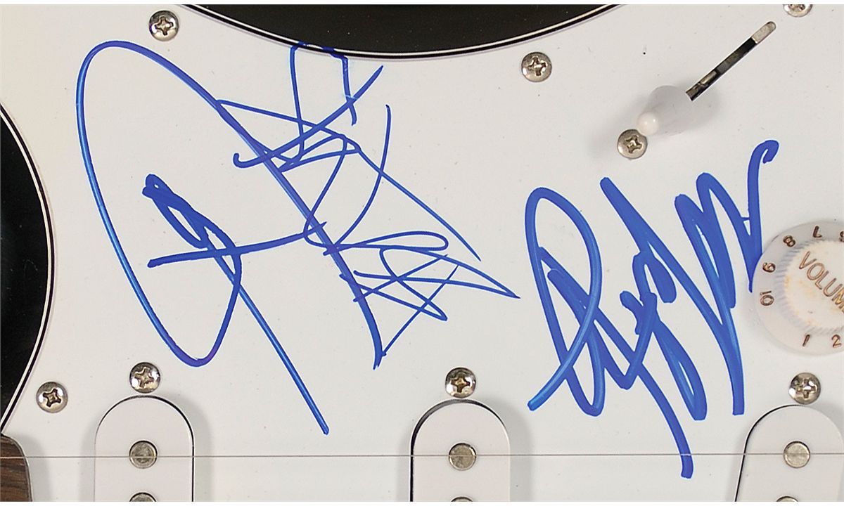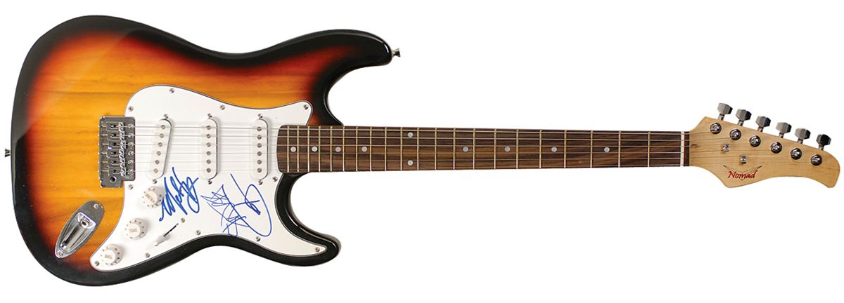 Sunburst-finish Nomad ‘stratocaster-style’ electric guitar, signed on the white pickguard in blue felt tip by Tom Delonge, Mark Hoppus, and Travis Barker. In fine condition. Oversized.