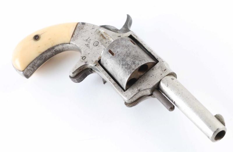Revolver. Single-Action. 5-rd capacity. Made in Norwich, CT. Circa. 1878. Nickel plated iron alloy. 2 3/4" round barrel with front blade. "Protector", and Pat'd Apr. 23 1878" stamped on barrel. Bore is good. Hammer cocks fine with cylinder removed, but sticks, and does not index properly with cylinder in place. "Birdshead" Ivory grips. Nickel finish is about 60% with flaking/rust spots. Grips are good. NRA Condition-Good. Cylinder does not index properly. Antique Firearm.