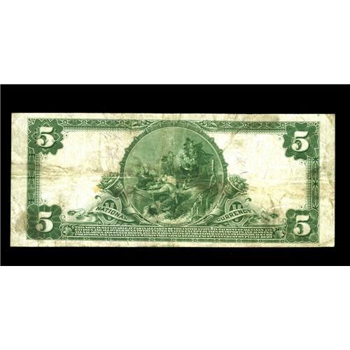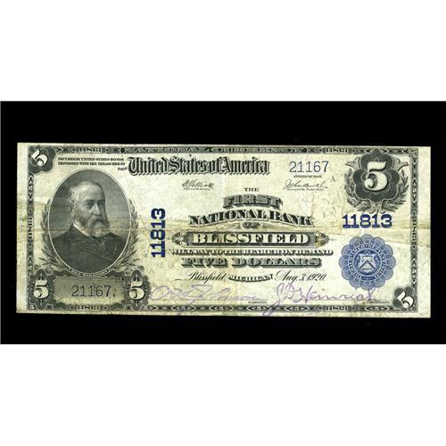 <B>Blissfield, MI</B></I> - $5 1902 Plain Back Fr. 607 <B>The First NB</B></I> Ch. # 11813<BR>This example offers excellent purple stamped signatures along with some original embossing, but the folds are hard and there is some light staining and soil present. <B>Fine-Very Fine.</B></I>