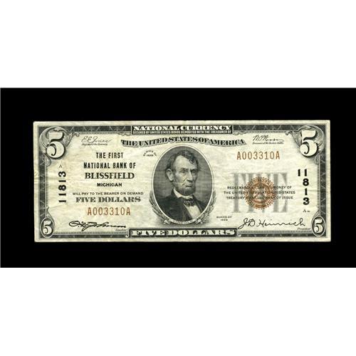 <B>Blissfield, MI</B></I> - $5 1929 Ty. 1 <B>The First NB</B></I> Ch. # 11813<BR>This one bank community is relatively easy to find in large size, but Series 1929 examples are another matter entirely, with the census showing just four such examples (including this piece) extant. Nice <B>Very Fine.</B></I>