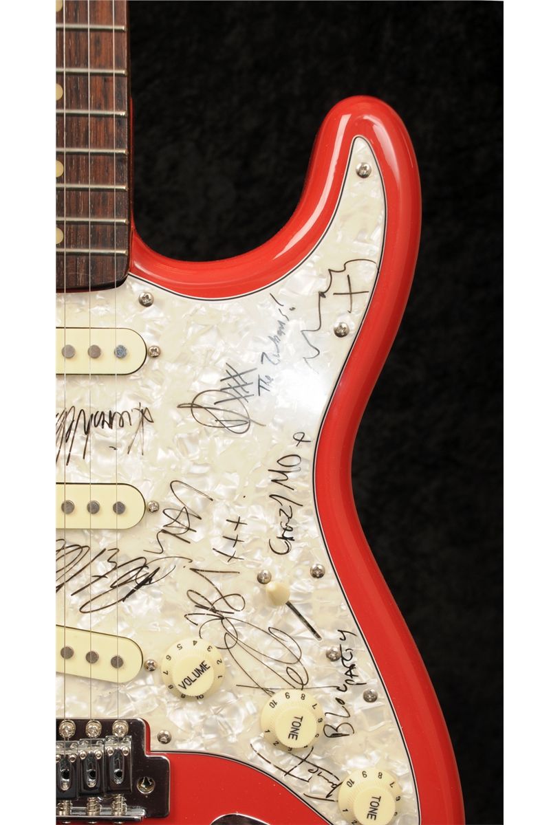 Bloc Party / The Zutons: a guitar autographed by both bands, a Stratocaster guitar, with a Fiesta Red finish, signed on the scratchplate by Kele Okereke, Russell Lissack, Gordon Moakes, Matt Tong, Abi Harding, Dave McCabe, Boyan Chowdhury, Sean Payne, Russell Pritchard and Paul Molloy Stratocaster in black marker