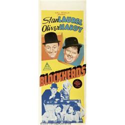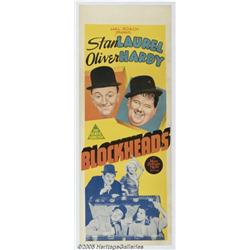 <B>Block-Heads (MGM, 1938)</B></I> Australian Daybill (15.25" X 40"). This 1938 Laurel and Hardy comedy stars the comedic duo as two former doughboys that served together is WWI. Stan doesn't know the war is over and is still guarding the trenches in France. Oliver takes pity on his old chum and takes him home for a visit, that where the laughs really begin. There are border imperfections; chips, dings and small tears. The poster has been professionally restored and displays well. Fine+ on Linen.