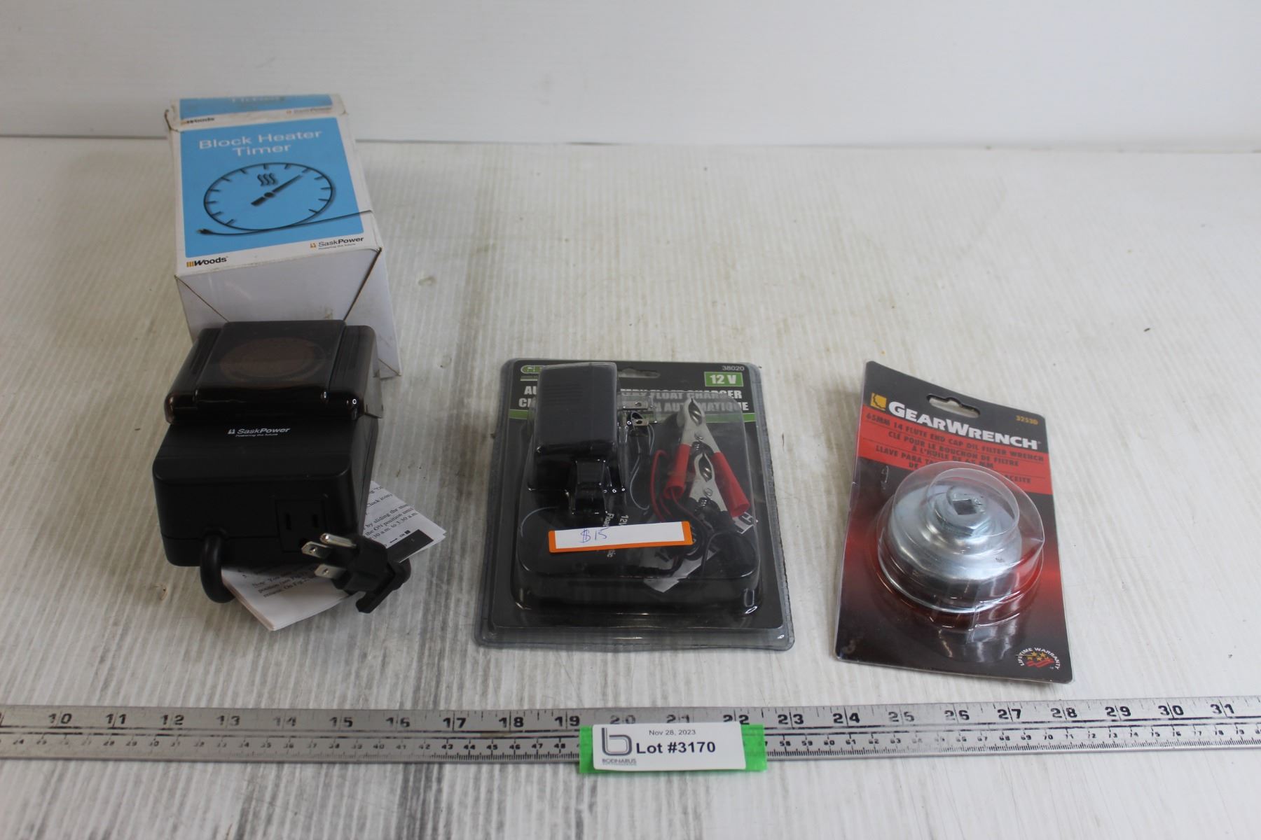 Block Heater Timer, Automatic Battery Float Charger, GearWrench 65mm 14 Flute End Cap Oil Filter Wrench