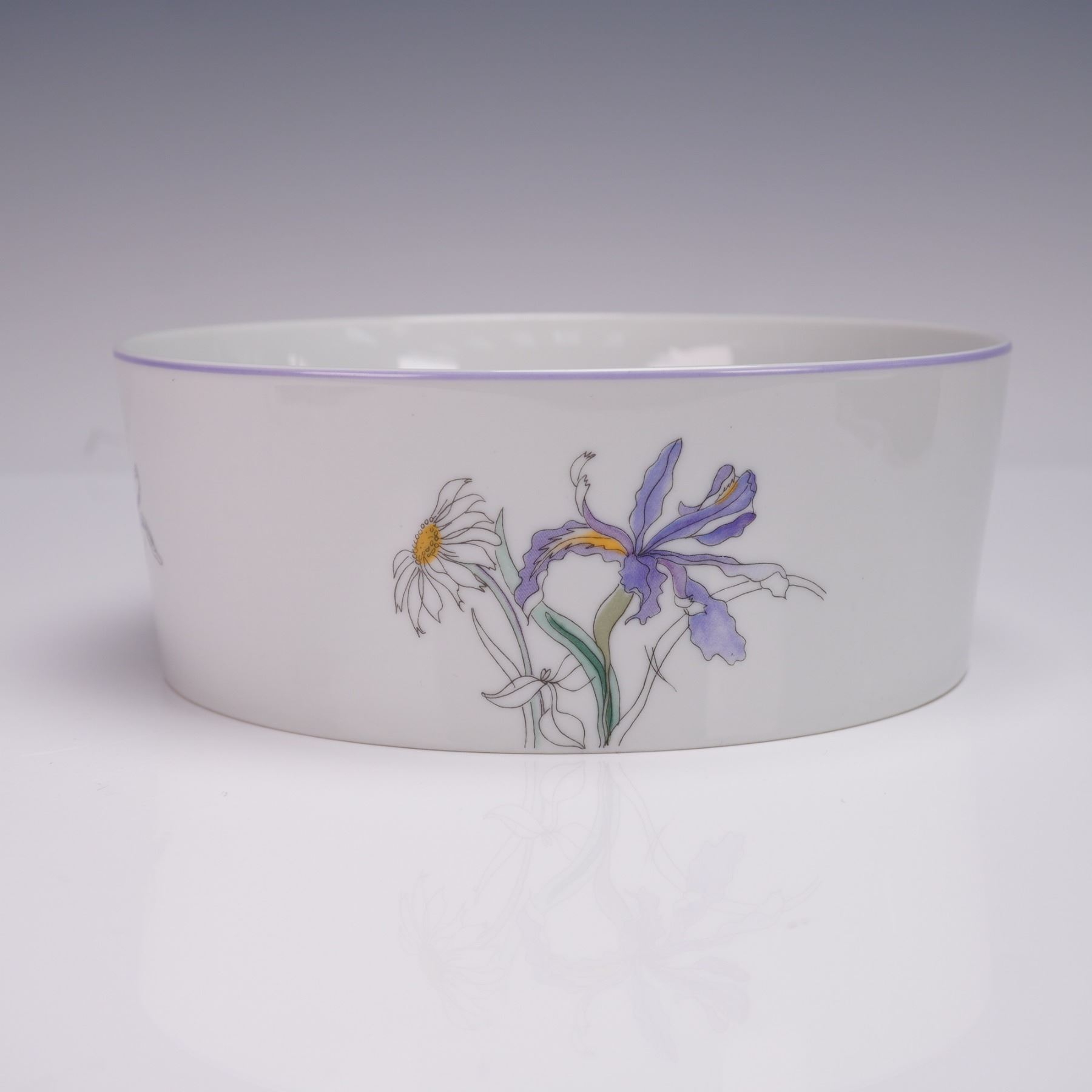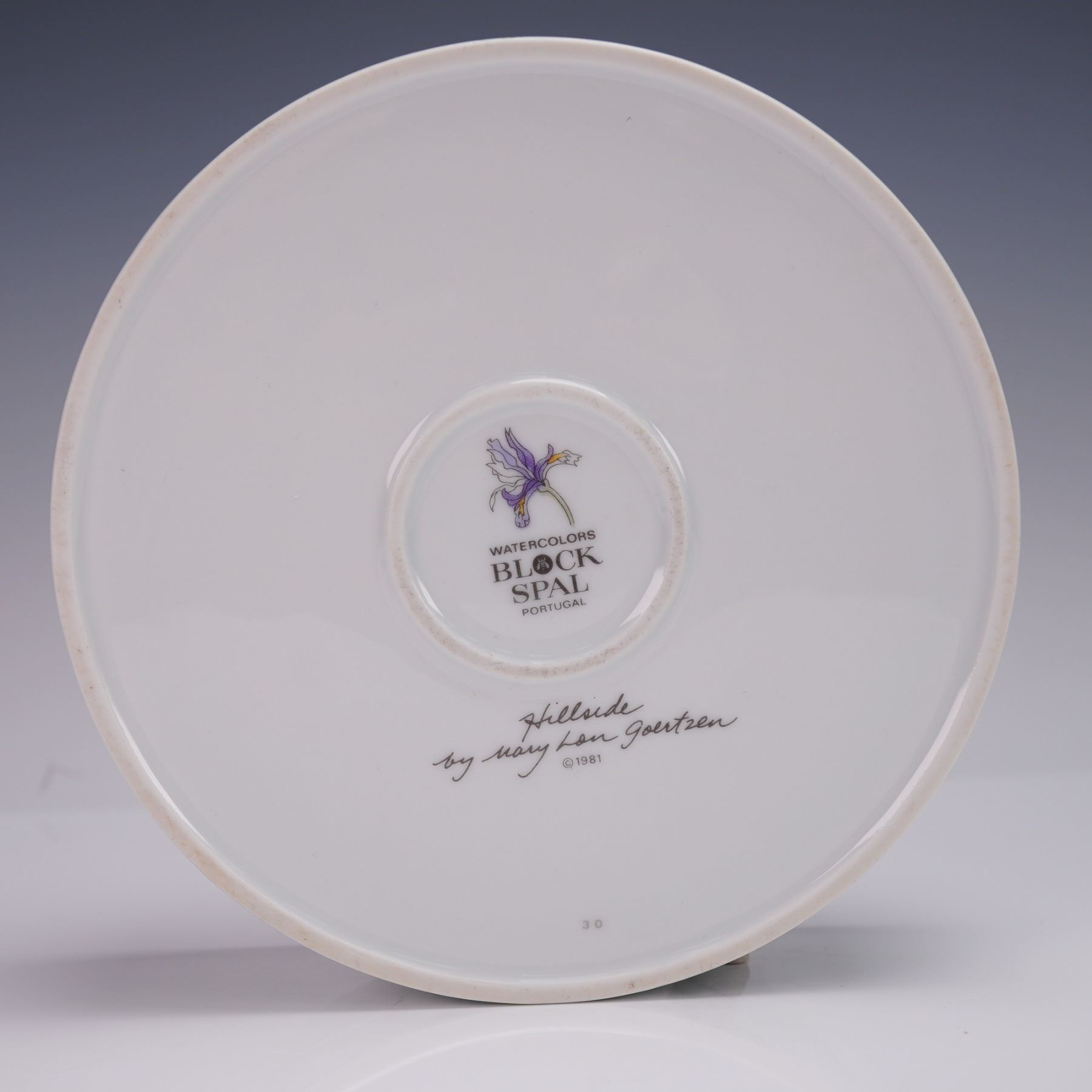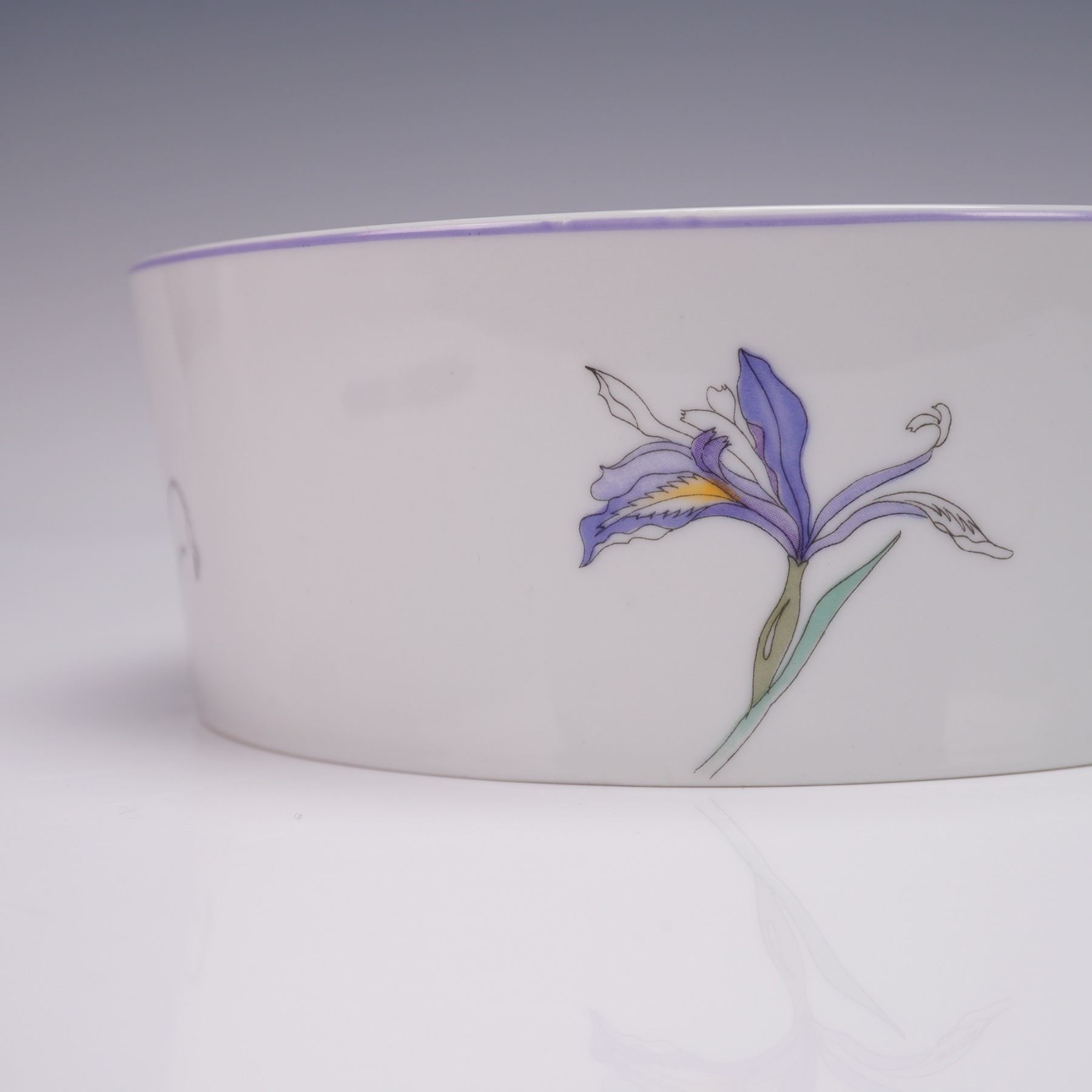 Block Spal porcelain bowl from the Watercolors series designed by Mary Lou Goertzen, titled Hillside and dated 1981. The exterior features finely drawn botanical illustrations of irises and daisies in soft lavender, yellow, and green, accented with a lavender rim. Marked to the underside with the full factory stamp and designer signature. Measures 8 inches in diameter and 3 inches high.