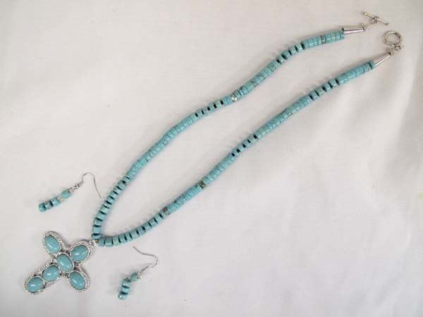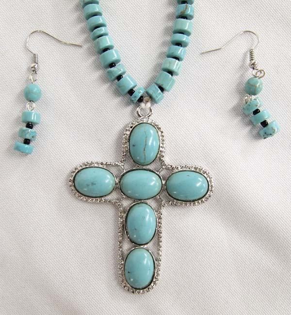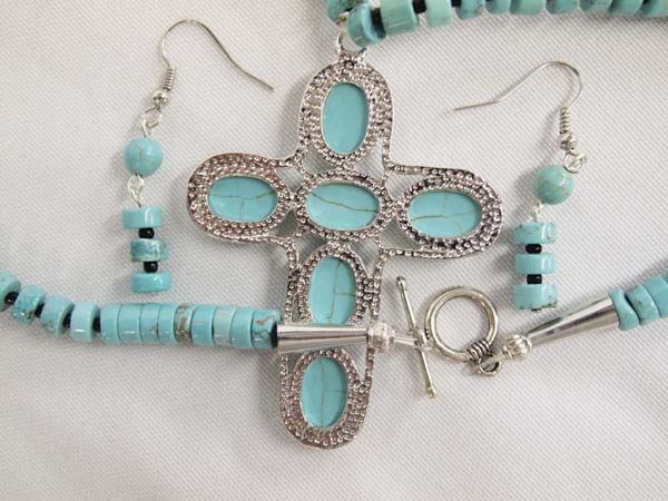 Block Turquoise Cross Pendant Necklace & Earrings, necklace measures 20'' end to end and earrings measure 1.75''L, 46.8g in total wt.