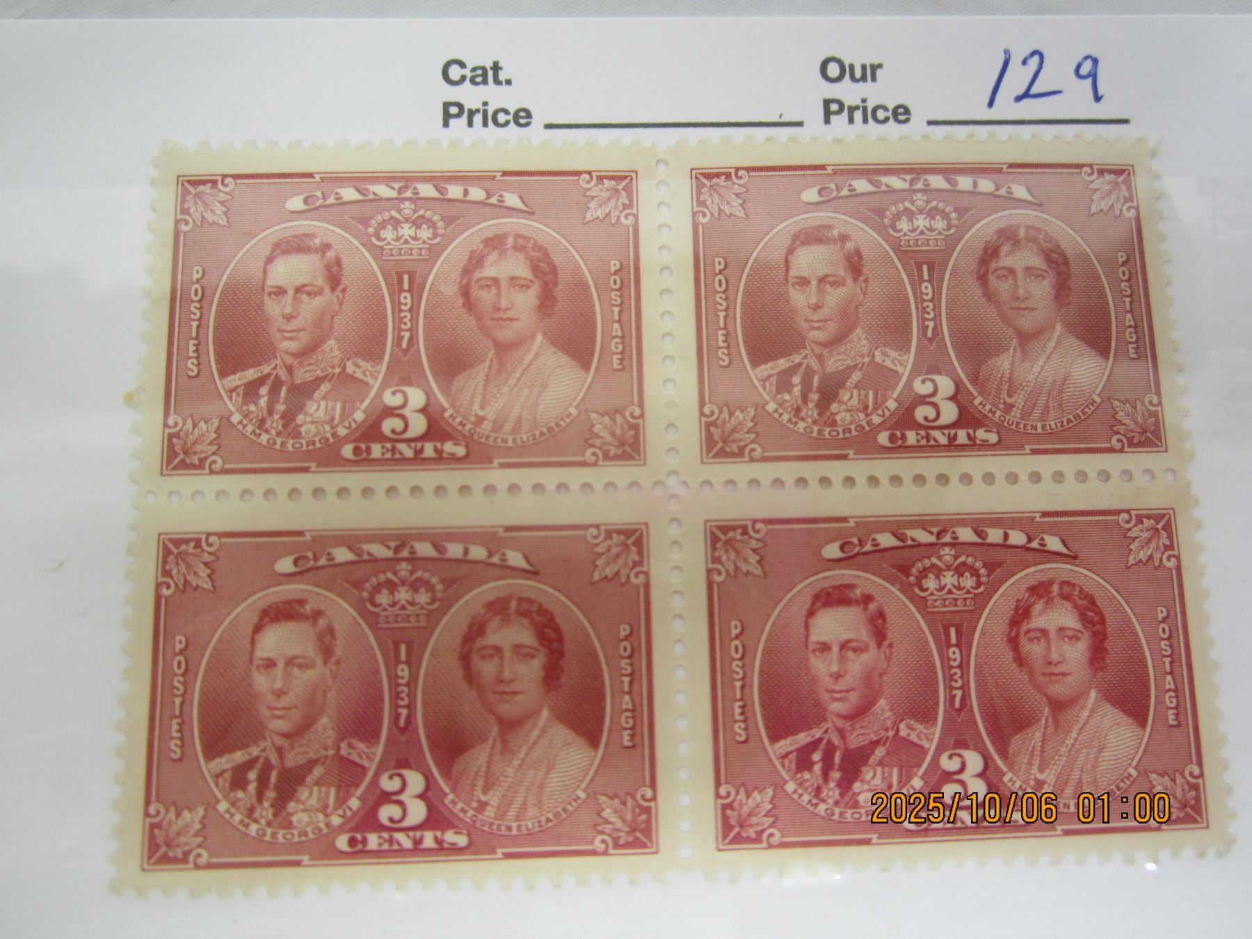 Block of 4 Canadian Stamps 1939 Royal Visit MNH OG Never Used