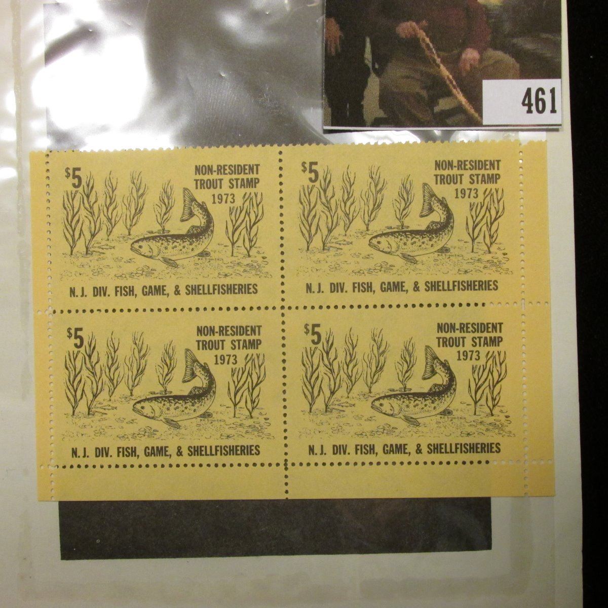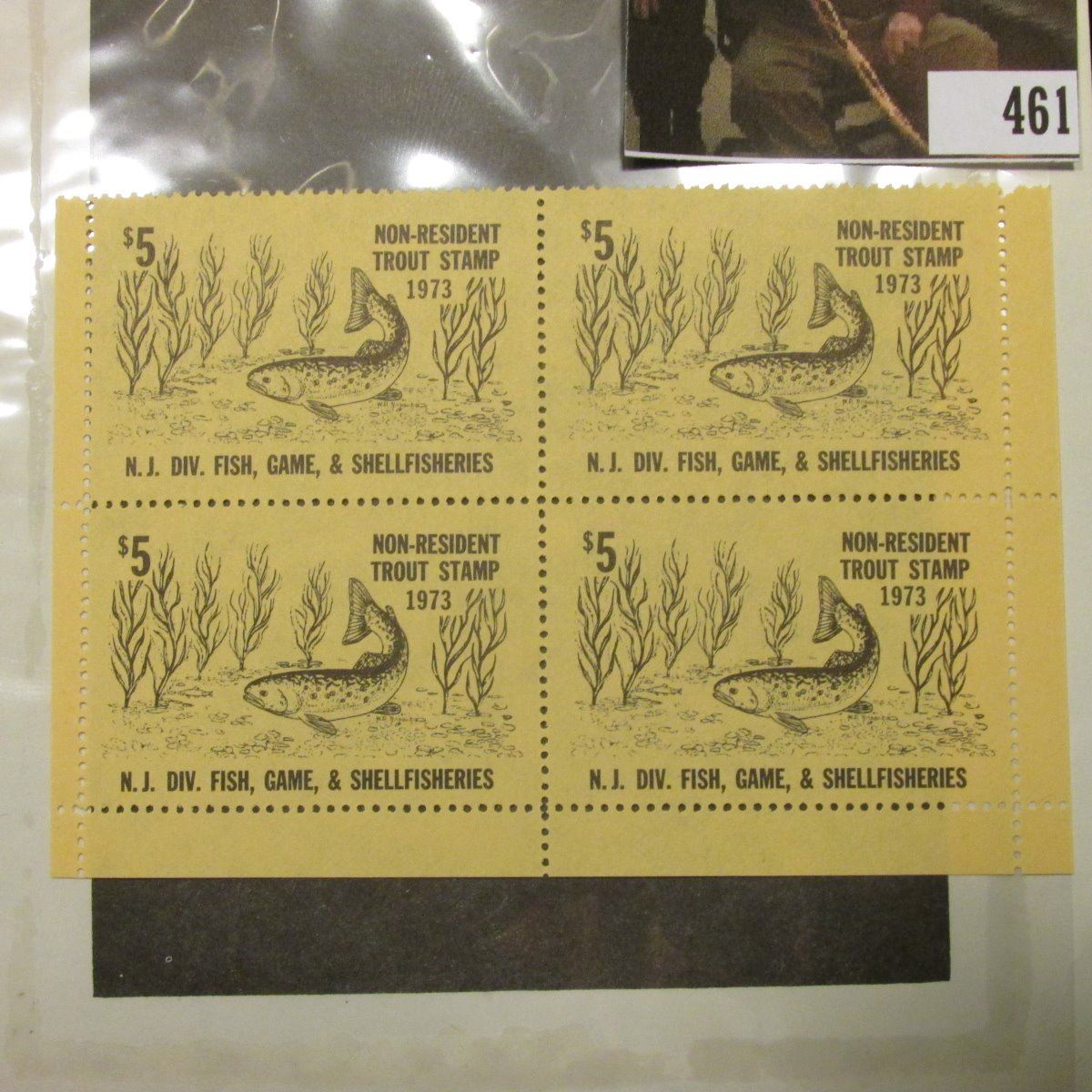Block of Four 1973 New Jersey Division of Fish, Game, & Shellfisheries $5 Non-Resident $2 Trout Stamps. Mint condition.