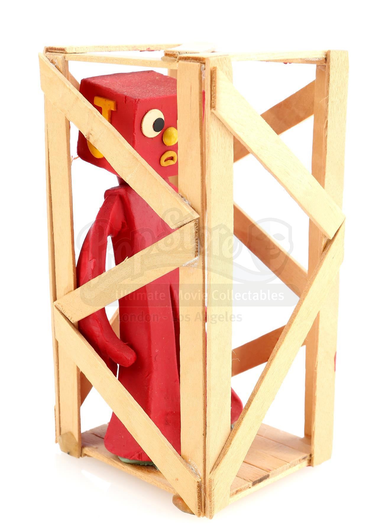 A Blockhead ‘J’ clay puppet from Art Clokey’s clay animation series Gumby Adventures. The hand-crafted humanoid red clay puppet features a yellow ‘J’ stuck on each side of a cubic head, resin eyes and a yellow clay nose and mouth. It is boxed in a wood crate with thin slats. The base of the crate is signed by series creator Art Clokey.