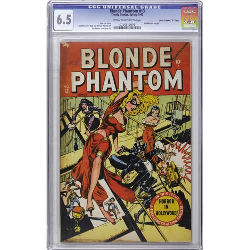 <B>Blonde Phantom #13 Davis Crippen ("D" Copy) pedigree (Timely, 1947) CGC FN+ 6.5 Cream to off-white pages.</B></I> The dizzying cover is by the ubiquitous Syd Shores, who also provided interior art alongside that of Don Rico and Ken Bald. Overstreet 2006 FN 6.0 value = $294; VF 8.0 value = $613. CGC census 9/06: 3 in 6.5, 5 higher. <I>From the Crippen Collection</B></I>.<BR><BR><b>Shipping:</b> Slabbed Comic (<a target="_blank" href="http://www.heritageauctions.com/common/shipping.php">view shipping information</a>)