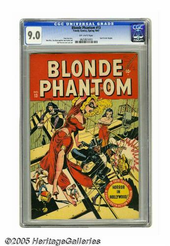 <B>Blonde Phantom #13 (Timely, 1947) CGC VF/NM 9.0 Off-white pages.</B></I> You can have the "surgically enhanced" superheroines of today. Our hearts still belong to the Blonde Phantom -- even if the most she ever revealed was a tantalizing expanse of leg. So what if Ginger Rogers danced in high heels, the Blonde Phantom <I>fought crime</B></I> in 'em! Inside the comic, Miss America adds to the pulchritude as star of a backup feature, and Timely VIP the Sub-Mariner gets a story as well. Overstreet 2005 VF/NM 9.0 value = $944; NM- 9.2 value = $1,275. CGC census 6/05: 1 in 9.0, 3 higher.