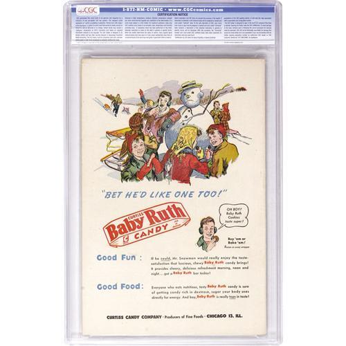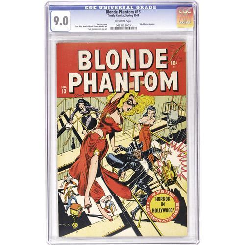 <B>Blonde Phantom #13 (Timely, 1947) CGC VF/NM 9.0 Off-white pages.</B></I> Syd Shores treats us to this cover displaying the Blonde Phantom and two lovely damsels while the four men on the cover appear to be caught in the "headlights." The Sub-Mariner begins a story line in the issue and the interior art is conveyed by Shores, Don Rico, and Ken Bald. This copy has very nice page quality. Overstreet 2006 VF/NM 9.0 value = $969; NM- 9.2 value = $1,325. CGC census 7/06: 1 in 9.0, 3 higher. <BR><BR><B>Important notice:</B> Heritage usually auctions material at the rate of 200-250 lots per hour. On some occasions eBay Live bid software or the Internet may not be able to keep up with the pace of the auction. We recommend placing a realistic absentee bid now as insurance to avoid disappointment. Occasionally the auctioneer may eliminate or reject an eBay Live bid, and the auctioneer may also reopen a lot after the close of the eBay live bidding (usually because we missed an audience bid), and may reject your bid even if it shows you as the winning bidder. By bidding via eBay Live, you agree that Heritage may award the lot to another bidder at its sole discretion under the circumstances described above or any other reasonable circumstances. Since eBay bids are not shown to us until we open the lot on the floor, we treat those bids just like floor bids. In most cases the floor responds before the eBay bid is presented to us, due to Internet lag time, so for consistency we have made it a policy that floor bids are always considered first over tie eBay live bids. Also please note that all Heritage lots purchased through eBay Live carry a 22.5% Buyer's Premium. Please make sure you read the Terms and Conditions before you bid. This lot is being auctioned in conjunction with a live floor auction by Heritage Auction Galleries. All final auction and invoice information will be supplied by Heritage Auction Galleries, and all other information should be considered preliminary. Lot:41001 <BR><BR><B>Winning Notification and Billing:</B> After the FINAL session in this auction is complete, Heritage will send e-mail and snail mail invoices. This process normally takes several days. All final auction and invoice information will be supplied by Heritage Auction Galleries, and all other information should be considered preliminary. <BR><BR>This auction will be conducted on a live auction floor and over the Internet through eBay Live. If you choose to place an absentee bid, please take a moment to <font color='#0000ff'><u><a href='http://pages.ebay.com/liveauctions/help/before/laabsentee.html'>learn how eBay Live absentee bidding works</a></u></font><font color='#000000'>