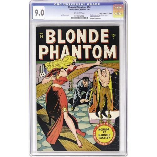 <B>Blonde Phantom #14 Davis Crippen ("D" Copy) pedigree (Timely, 1947) CGC VF/NM 9.0 Off-white pages.</B></I> Syd Shores is credited with this torture cover featuring our heroine. Meanwhile, the Sub-Mariner has a feature of his own in the issue, and Namora appears as well. Overstreet 2006 VF/NM 9.0 value = $897; NM- 9.2 value = $1,225. CGC census 6/06: 3 in 9.0, 1 higher. <I>From the Crippen Collection.</B></I> <BR><BR><B>Important notice:</B> Heritage usually auctions material at the rate of 200-250 lots per hour. On some occasions eBay Live bid software or the Internet may not be able to keep up with the pace of the auction. We recommend placing a realistic absentee bid now as insurance to avoid disappointment. Occasionally the auctioneer may eliminate or reject an eBay Live bid, and the auctioneer may also reopen a lot after the close of the eBay live bidding (usually because we missed an audience bid), and may reject your bid even if it shows you as the winning bidder. By bidding via eBay Live, you agree that Heritage may award the lot to another bidder at its sole discretion under the circumstances described above or any other reasonable circumstances. Since eBay bids are not shown to us until we open the lot on the floor, we treat those bids just like floor bids. In most cases the floor responds before the eBay bid is presented to us, due to Internet lag time, so for consistency we have made it a policy that floor bids are always considered first over tie eBay live bids. Also please note that all Heritage lots purchased through eBay Live carry a 22.5% Buyer's Premium. Please make sure you read the Terms and Conditions before you bid. This lot is being auctioned in conjunction with a live floor auction by Heritage Auction Galleries. All final auction and invoice information will be supplied by Heritage Auction Galleries, and all other information should be considered preliminary. Lot:41001 <BR><BR><B>Winning Notification and Billing:</B> After the FINAL session in this auction is complete, Heritage will send e-mail and snail mail invoices. This process normally takes several days. All final auction and invoice information will be supplied by Heritage Auction Galleries, and all other information should be considered preliminary. <BR><BR>This auction will be conducted on a live auction floor and over the Internet through eBay Live. If you choose to place an absentee bid, please take a moment to <font color='#0000ff'><u><a href='http://pages.ebay.com/liveauctions/help/before/laabsentee.html'>learn how eBay Live absentee bidding works</a></u></font><font color='#000000'>
