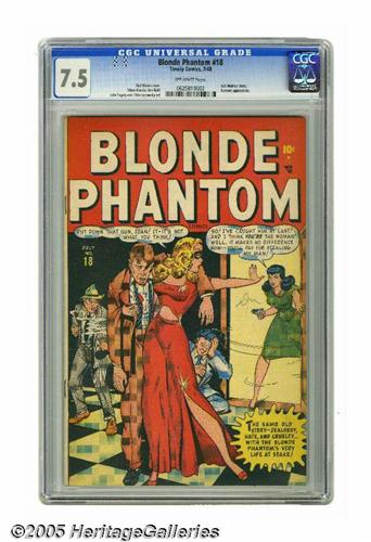<B>Blonde Phantom #18 (Timely, 1948) CGC VF- 7.5 Off-white pages.</B></I> Syd Shore's enticing cover makes us want to crack the slab and look for the catfight! Vince Alascia, Ken Bald, and Mike Sekowsky are among the contributing interior artists. CGC has certified just one other copy of #18, and it wasn't nearly as nice as this one. Overstreet 2005 VF 8.0 value = $481. CGC census 7/05: 1 in 7.5, none higher.