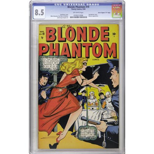 <B>Blonde Phantom #19 Davis Crippen ("D" Copy) pedigree (Timely, 1948) CGC VF+ 8.5 Off-white pages.</B></I> The versatile Syd Shores drew a slew of covers and characters over his long career in comics, but when <I>we</B></I> think of Syd Shores, we think of the Blonde Phantom, and this cover is a perfect example why! Sub-Mariner and Namora are featured in a story inside. Overstreet 2006 VF 8.0 value = $481; VF/NM 9.0 value = $761. CGC census 9/06: 1 in 8.5, 4 higher. <I>From the Crippen Collection</B></I>.<BR><BR><b>Shipping:</b> Slabbed Comic (<a target="_blank" href="http://www.heritageauctions.com/common/shipping.php">view shipping information</a>)