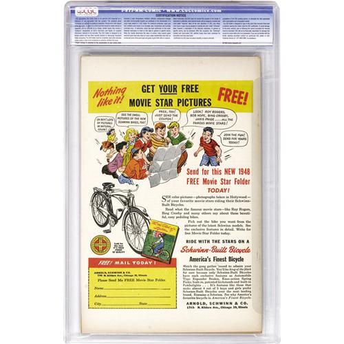 <B>Blonde Phantom #19 Davis Crippen ("D" Copy) pedigree (Timely, 1948) CGC VF/NM 9.0 Off-white to white pages.</B></I> Syd Shores doesn't get enough credit for some of the innovative covers he produced for this series! The issue has Ken Bald interior art, plus a Sub-Mariner story drawn by Mike Sekowsky. Overstreet 2006 VF/NM 9.0 value = $761; NM- 9.2 value = $1,040. CGC census 6/06: 3 in 9.0, 1 higher. <I>From the Crippen Collection.</B></I> <BR><BR><B>Important notice:</B> Heritage usually auctions material at the rate of 200-250 lots per hour. On some occasions eBay Live bid software or the Internet may not be able to keep up with the pace of the auction. We recommend placing a realistic absentee bid now as insurance to avoid disappointment. Occasionally the auctioneer may eliminate or reject an eBay Live bid, and the auctioneer may also reopen a lot after the close of the eBay live bidding (usually because we missed an audience bid), and may reject your bid even if it shows you as the winning bidder. By bidding via eBay Live, you agree that Heritage may award the lot to another bidder at its sole discretion under the circumstances described above or any other reasonable circumstances. Since eBay bids are not shown to us until we open the lot on the floor, we treat those bids just like floor bids. In most cases the floor responds before the eBay bid is presented to us, due to Internet lag time, so for consistency we have made it a policy that floor bids are always considered first over tie eBay live bids. Also please note that all Heritage lots purchased through eBay Live carry a 22.5% Buyer's Premium. Please make sure you read the Terms and Conditions before you bid. This lot is being auctioned in conjunction with a live floor auction by Heritage Auction Galleries. All final auction and invoice information will be supplied by Heritage Auction Galleries, and all other information should be considered preliminary. Lot:41001 <BR><BR><B>Winning Notification and Billing:</B> After the FINAL session in this auction is complete, Heritage will send e-mail and snail mail invoices. This process normally takes several days. All final auction and invoice information will be supplied by Heritage Auction Galleries, and all other information should be considered preliminary. <BR><BR>This auction will be conducted on a live auction floor and over the Internet through eBay Live. If you choose to place an absentee bid, please take a moment to <font color='#0000ff'><u><a href='http://pages.ebay.com/liveauctions/help/before/laabsentee.html'>learn how eBay Live absentee bidding works</a></u></font><font color='#000000'>