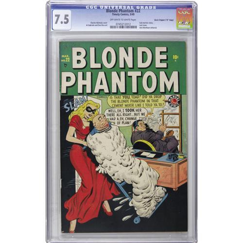 <B>Blonde Phantom #22 Davis Crippen ("D" Copy) pedigree (Timely, 1949) CGC VF- 7.5 Off-white to white pages.</B></I> The final issue of the title featured a Charles Nicholas cover and interior art by Don Rico and Al Gabriele, an anti-Wertham editorial, and a Sub-Mariner story. This is far and away the highest-graded copy in CGC's census -- second place is at only VG/FN 5.0! Overstreet 2006 VF 8.0 value = $761. CGC census 9/06: 1 in 7.5, none higher. <I>From the Crippen Collection</B></I>.<BR><BR><b>Shipping:</b> Slabbed Comic (<a target="_blank" href="http://www.heritageauctions.com/common/shipping.php">view shipping information</a>)