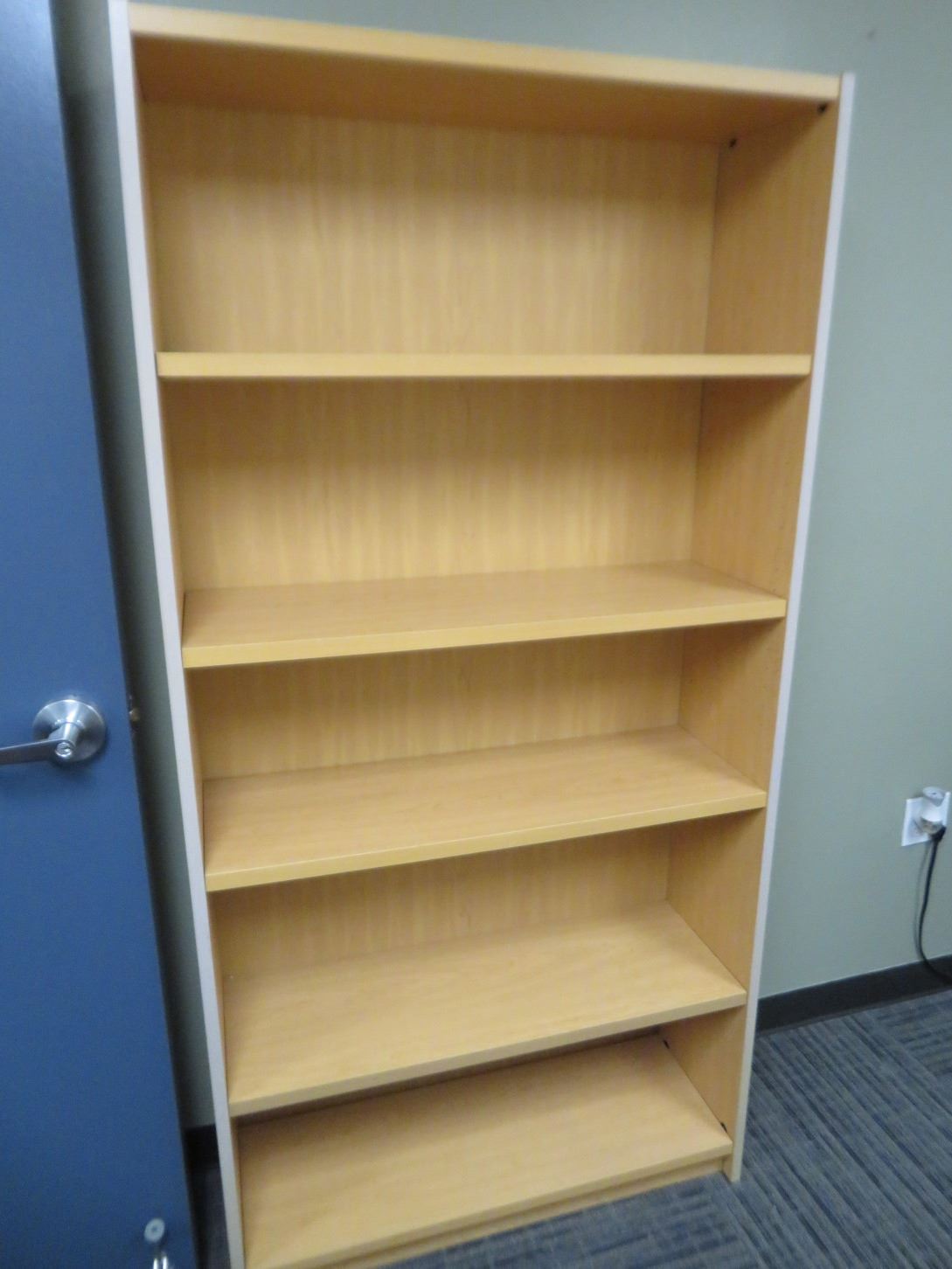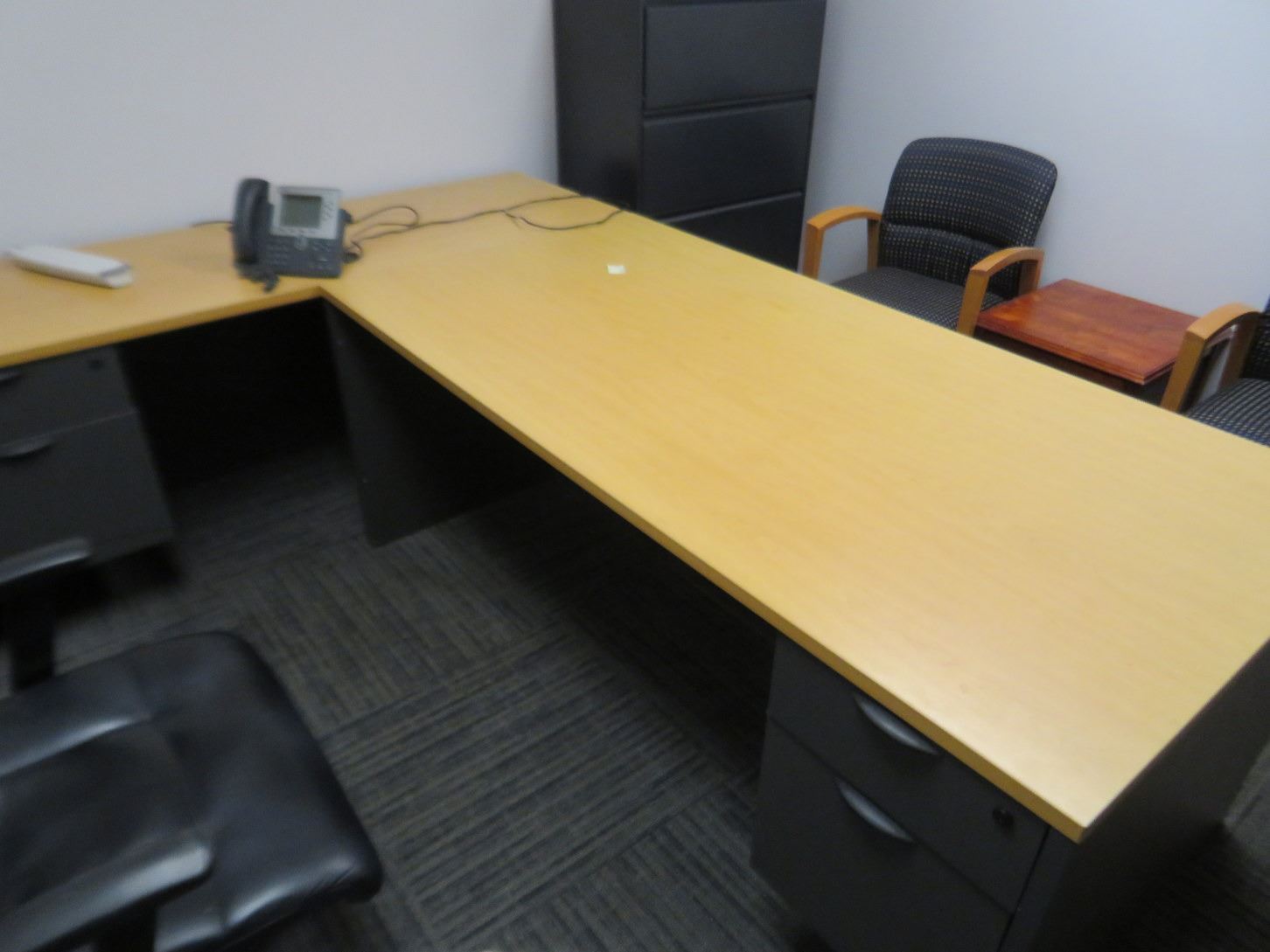 Blonde Wood Laminate Desk w/Return & Matching Bookcase & Chairs