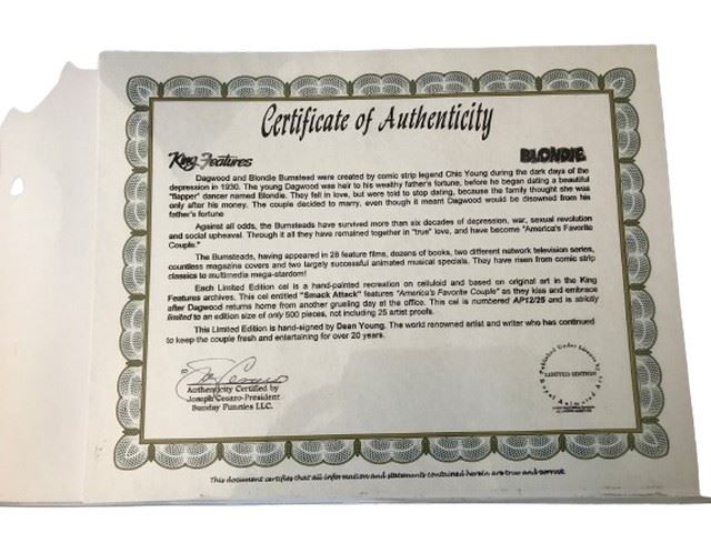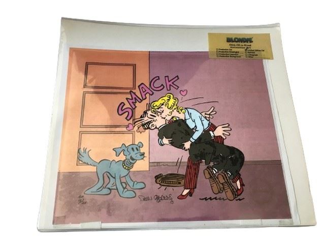 Blondie animation cel with COA - 12/25, titled "Smack Attack" features America's favorite couple, Dagwood and Blondie Bumstead from the comic strip. hand signed by Dean Young, the world renowned artist and writer of this series for over 20 years.