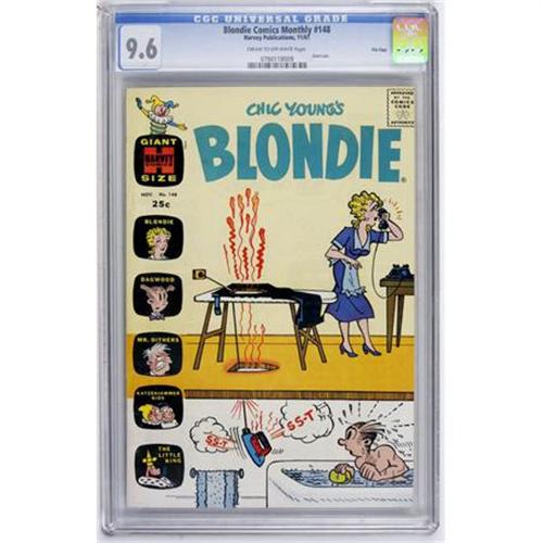<B>Blondie Comics #148 File Copy (Harvey, 1961) CGC NM+ 9.6 Cream to off-white pages.</B></I> Giant-size, 80-page issue. Overstreet 2007 NM- 9.2 value = $32. CGC census 9/07: 1 in 9.6, none higher.<BR><BR><b>Shipping:</b> Comics - Slabbed (certified) (<a target="_blank" href="http://www.heritageauctions.com/common/shipping.php">view shipping information</a>)