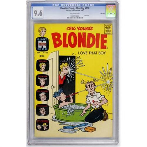 <B>Blondie Comics #158 File Copy (Harvey, 1963) CGC NM+ 9.6 Off-white pages.</B></I> Giant-size, 80-page issue. Overstreet 2007 NM- 9.2 value = $32. CGC census 9/07: 1 in 9.6, none higher.<BR><BR><b>Shipping:</b> Comics - Slabbed (certified) (<a target="_blank" href="http://www.heritageauctions.com/common/shipping.php">view shipping information</a>)
