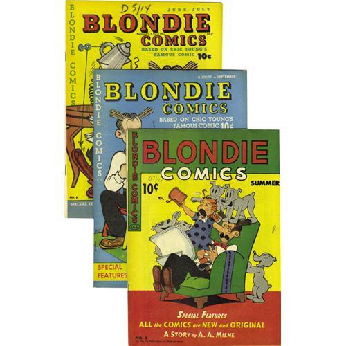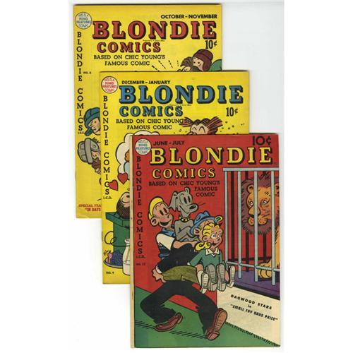 Family fun with the Bumstead clan awaits the winner of this lot. Early issues of Blondie are surprisingly tough to find! Issues include: #2 (VF-), #6 (VF/NM), #7 (VF), #8 (Double cover -- first cover FN/VF, second cover VF, overall grade VF), #9 (VF), #12 (VF), #13 (FN+), #14 (VF), #16 (first Harvey issue - VF), #17 (FN-), #21 (FN+), a second copy of #21 (VG+), #22 (VF), #23 (VF+), #25 (FN-), #26 (FN+), #27 (VG), #28 (VF), #30 (VG/FN), #31 (VF), and #33 (VF-). Approximate Overstreet value for group = $700. <I>From the Crippen Collection.</B></I><BR><BR><b>Shipping:</b> Un-Slabbed Comic (<a target="_blank" href="http://www.heritageauctions.com/common/shipping.php">view shipping information</a>)