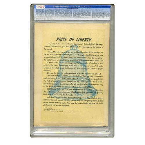 <B>Blood Is the Harvest #nn (Catechetical Guild, 1950) CGC NM+ 9.6 White pages.</B></I> Only 13 copies of this full-color version are said to exist! This anti-Communist propaganda comic tells the tale of a boy who turns in his own father to the police state, resulting in the execution of his family and everyone who lived on his street. The narrator concludes the issue by wryly asking, "What if the whole world were Soviet?" Overstreet 2005 NM- 9.2 value = $1,800. CGC census 12/05: 2 in 9.6, none higher.