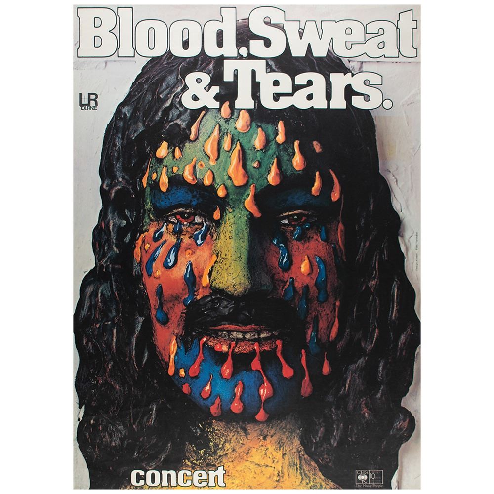 Excellent original color 23.75 x 33 poster for a Blood Sweat and Tears concert in Germany in 1973, featuring artwork by Gunther Kieser from a photo by Hans Hartmann, which depicts a man with long hair bleeding, sweating, and crying. Rolled and in fine condition, with some light edgewear, most notably to the lower left.