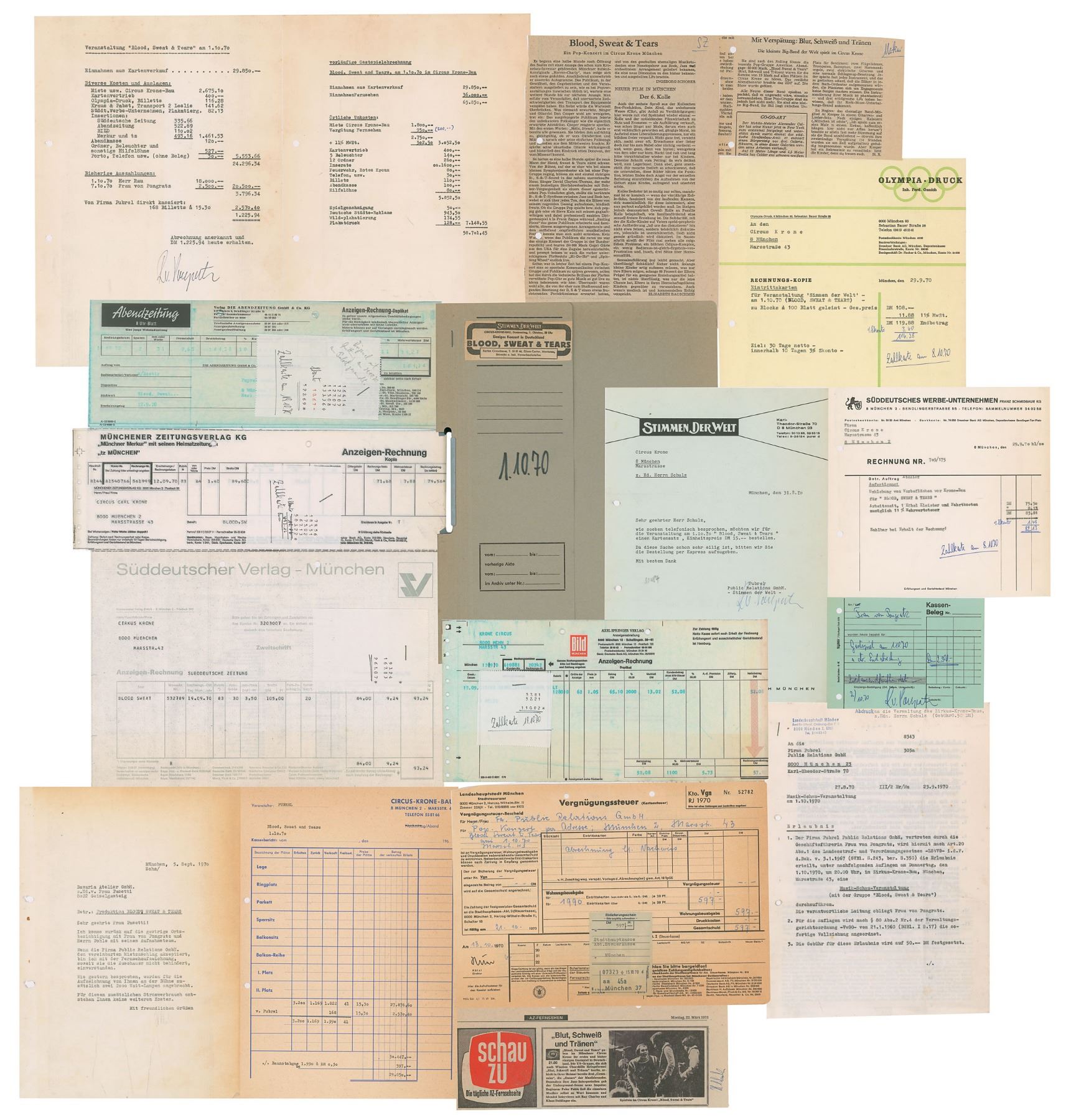 Bracket-bound 9.25 x 12 folder of German-language material relating to a Blood, Sweat & Tears concert at the Circus-Krone-Bau in Munich, Germany on October 1, 1970. The booklet contains the original four-page contract between the city of Munich and the concert organizers to put on the show, several sheets and packets related to venue costs, requirements, and ticket sales, additional correspondence, and newspaper clippings. In overall fine condition. Accompanied by a certificate of authenticity from Tracks.