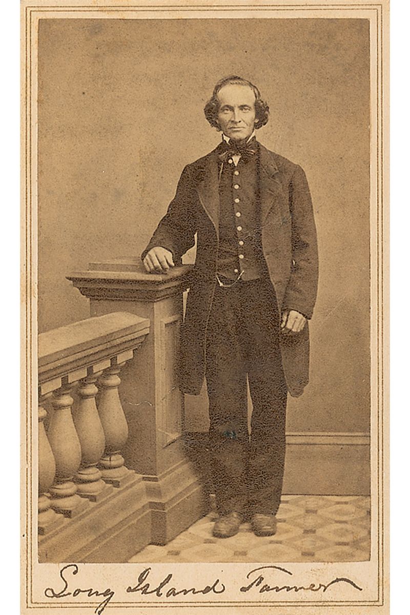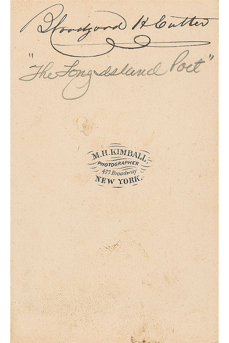 Colorful 19th century poet (1817–1906). Original 2.25 x 4 full-length carte-de-visite photo by M. H. Kimball of New York, signed on the reverse in black ink, “Bloodgood H. Cutter,” adding “Long Island Farmer” in the lower border under his image. In fine condition, with a pencil notation in another hand under the signature.