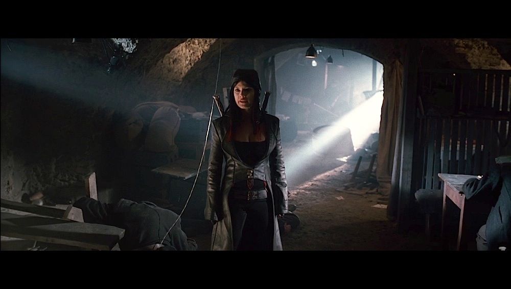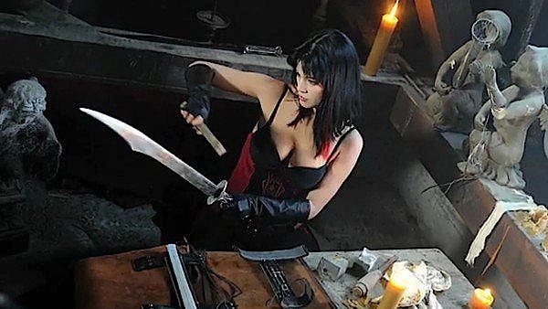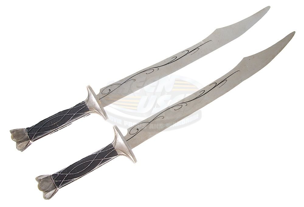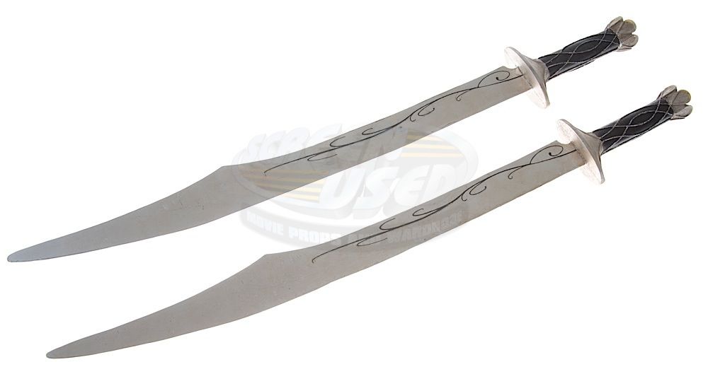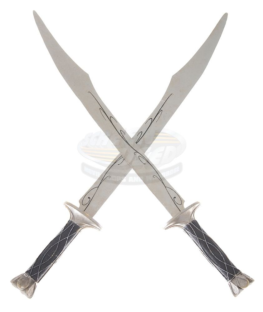 (Brightlight Pictures, 2010) These prop swords were custom-made by the production for use by Natassia Malthe as "Rayne". The swords are made of a very light weight material, measure 30" in length and have applied detailing along the blade sides. Wear from use is present.