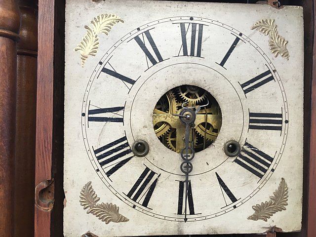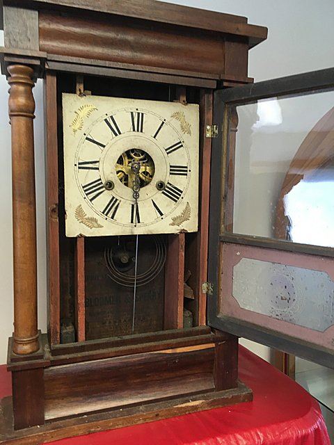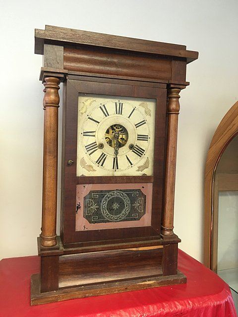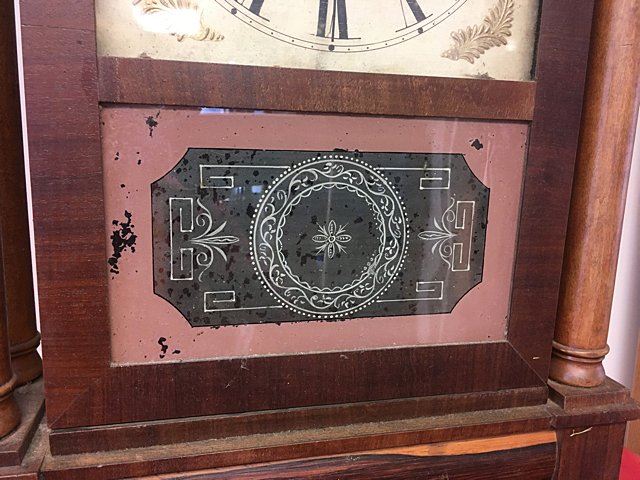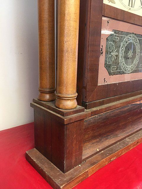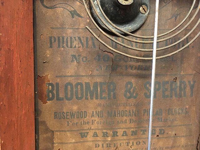 Bloomer & Sperry Portico Rosewood and Mahogany Pillar Clock, 1945-1846, New York. 4 column clock, hand painted dial with raised gilt, reverse painted lower tablet, 30 hour weight driven early brass movement. Nice label "Phoenix Manufacturing, No. 40 Gold Street, New York. Bloomer & Sperry, Manufacturers of Rosewood and Mahogany Pillar Clocks for the Foreign and Domestic Market". Bloomer and Sperry sold clocks out of New York for just two years. Measures approx. 25" tall x 16" wide x 4 1/2" deep.