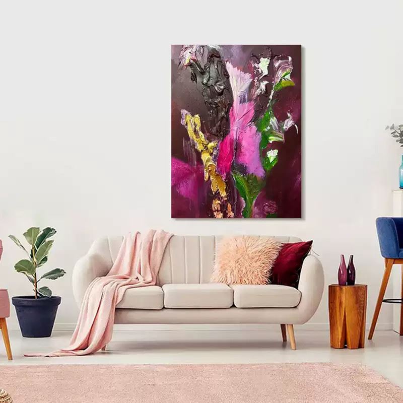 This artwork uses bold colors and thick brushstrokes to depict the moment a flower blooms. The interplay of deep purples and vibrant pinks conveys a dreamlike beauty, as if the flowers are blooming in a dream, full of strength and vitality. Dimensions: 24 x 31 inches.