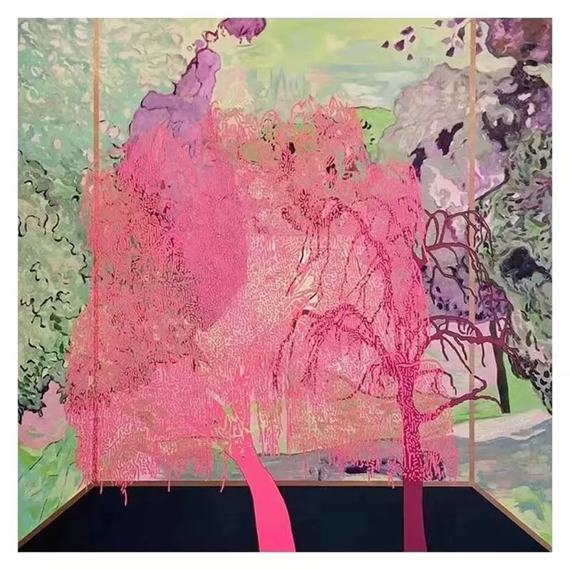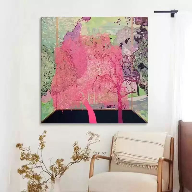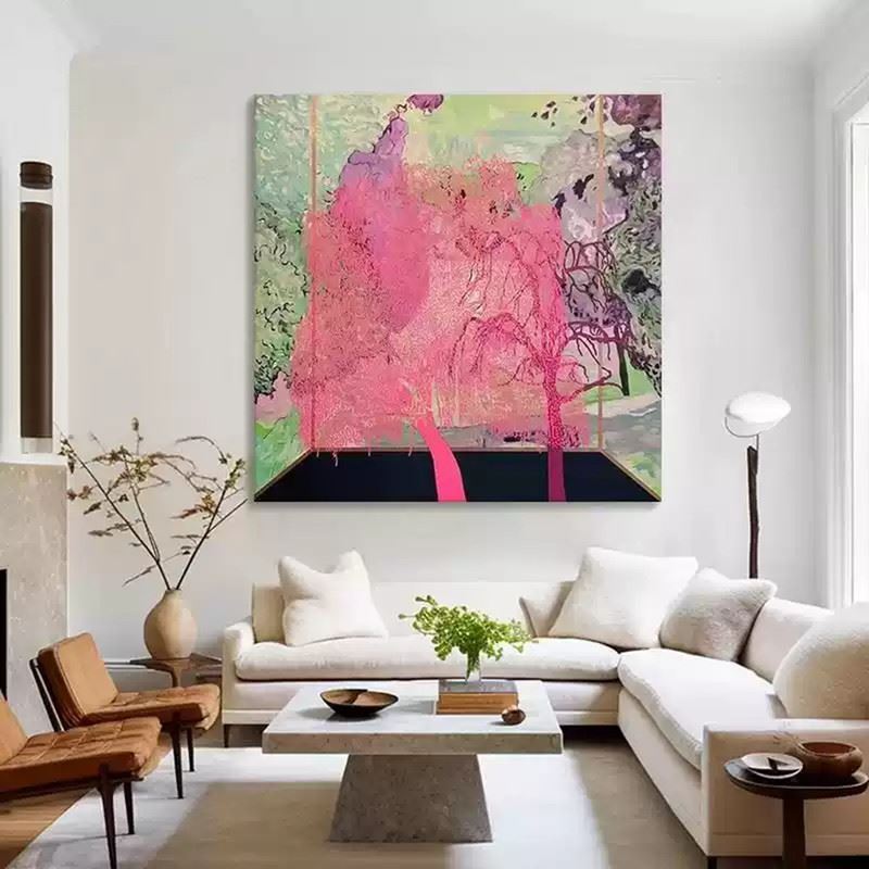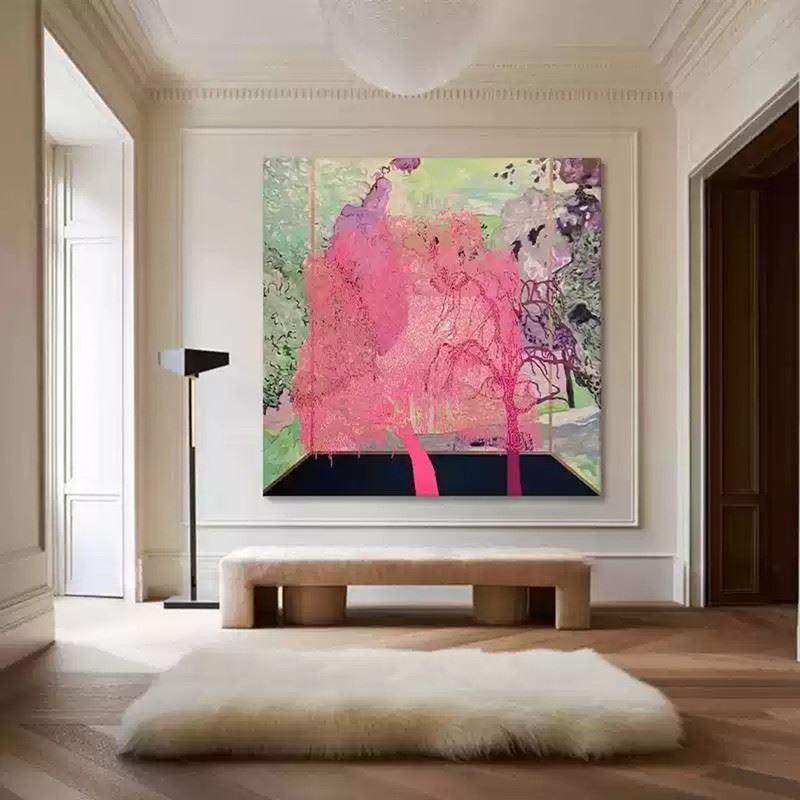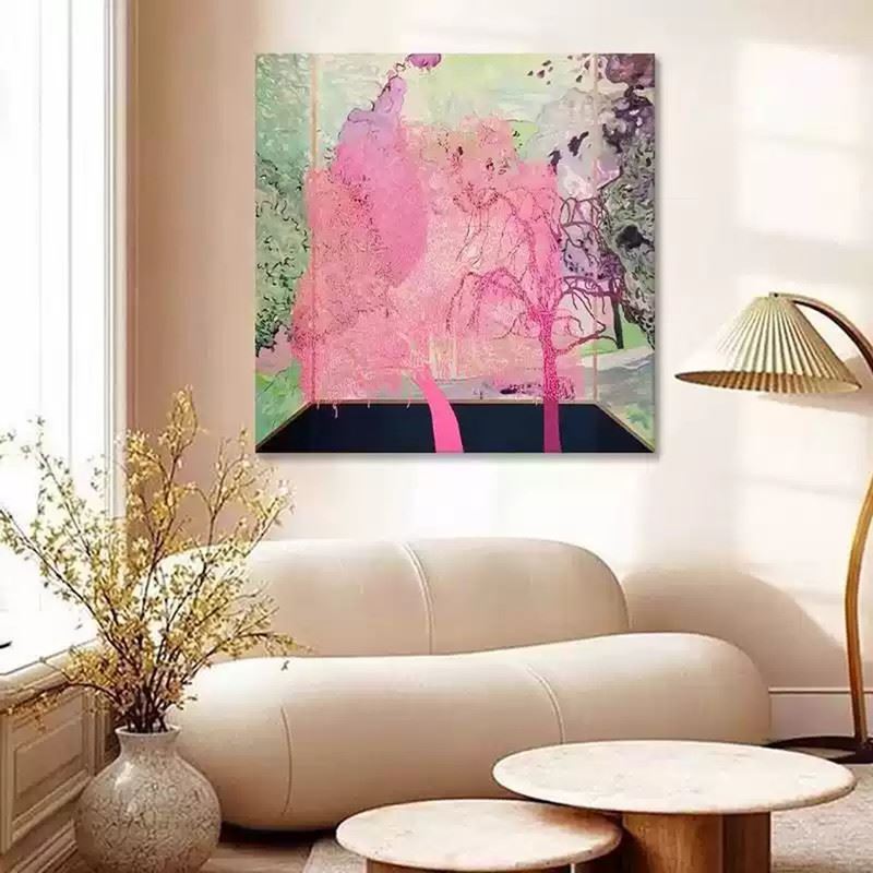 This captivating piece invites the viewer into a surreal landscape where nature blooms in unexpected ways. The vivid pink trees stand out against the soft, muted greens and purples of the background, creating a dreamlike atmosphere. The blending of colors evokes a sense of fluidity, as if the trees are melting into the surroundings. The perspective suggests an indoor space looking out into nature, where reality and imagination blend seamlessly. The soft texture and flowing lines capture a moment of serene beauty and transformation. Dimensions: 31 x 31 inches.