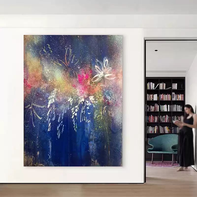 This painting depicts a dreamy blue night, with flowers seemingly blooming quietly under the starry sky. The vibrant petals contrast with the deep blue background, while golden and pink specks of light twinkle like stars in the night sky, adding a touch of mystery and romance to the scene. Delicate lines outline the flowers, bringing them to life with a sense of motion. The painting as a whole is filled with a dreamy, soft atmosphere, evoking a poetic and enigmatic story, transporting the viewer into an imaginary nightscape. Dimensions: 24 x 31 inches.