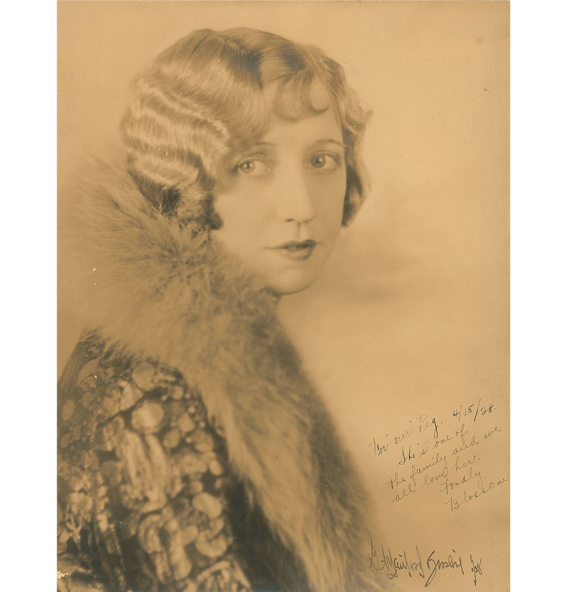 Character actress (1895–1978) best known for her role as Grandmama Addams on the TV series The Addams Family. Vintage sepia matte-finish 10 x 13.25 photo, signed and inscribed in fountain pen, “For ‘our’ Peg, 4/15/28, She’s one of the family and we all love her. Fondly, Blossom.” In fine condition, with slightly trimmed edges, a few trivial spots of surface loss, and photographer’s notation along bottom edge.