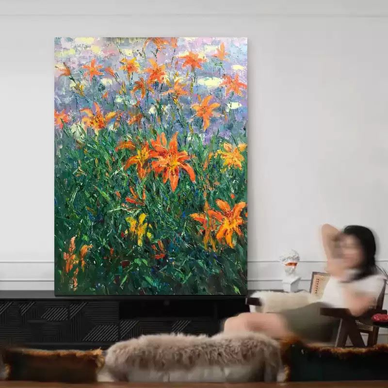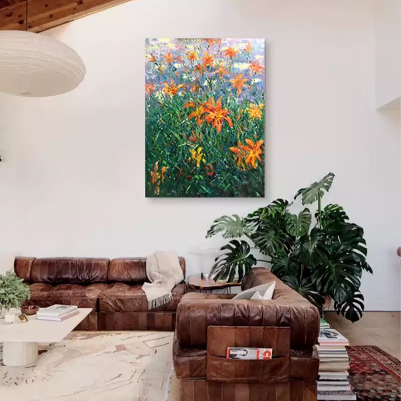 Clusters of vivid orange blossoms unfurl amid deep green foliage, as if drawing all the sunlight to the earth. Bold, luminous strokes set the flowers and grasses in motion, letting the warmth of life ripple through the painted breeze. Dimensions: 24 x 31 inches.