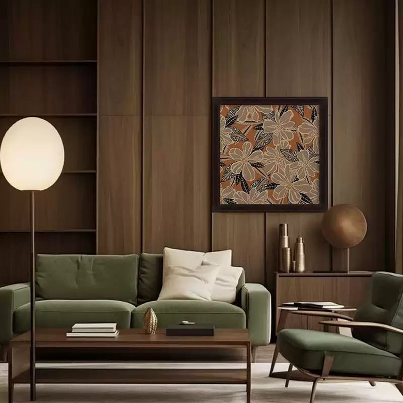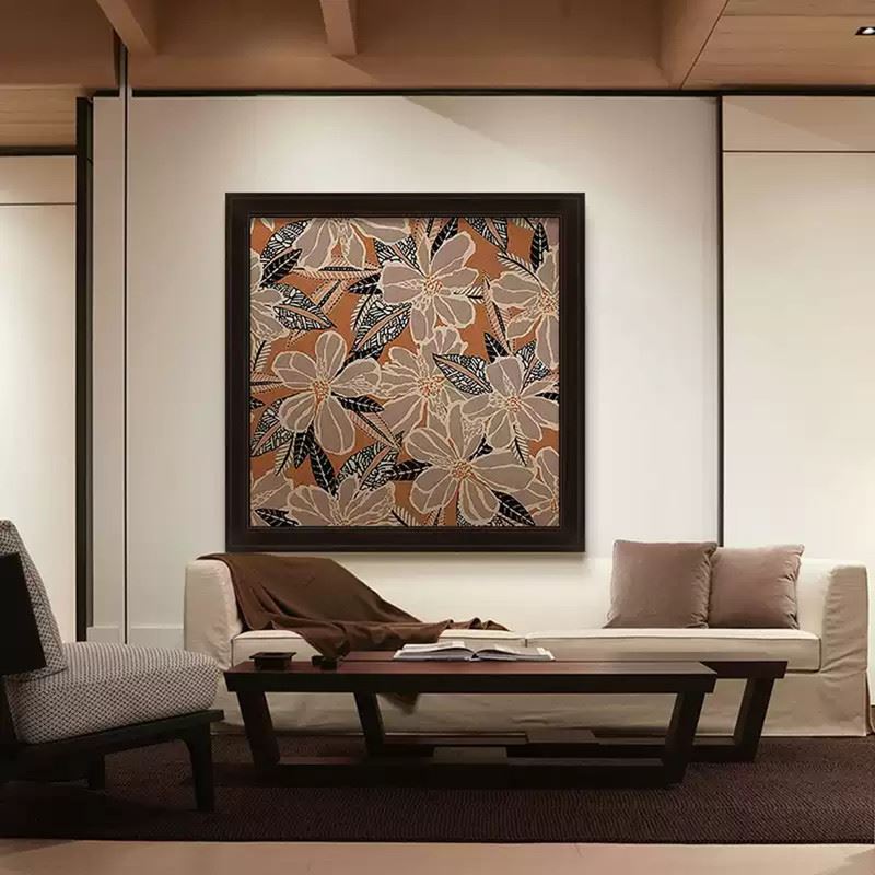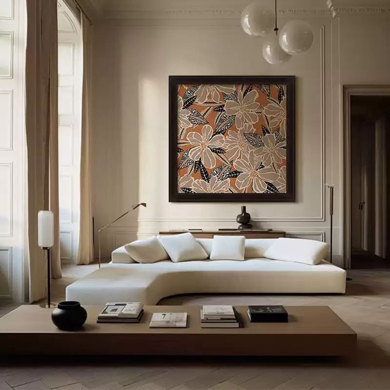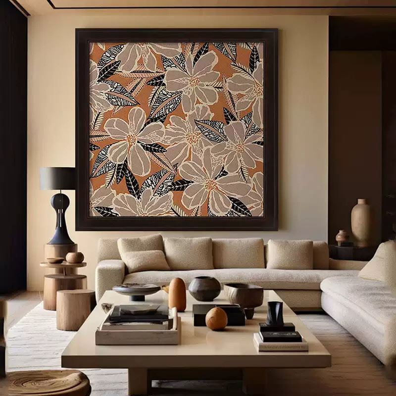 This artwork, with its soft tones and simple floral patterns, captures the purity and beauty of nature. The warm background color contrasts with the black-and-white petals, creating an atmosphere that is both tranquil and full of life. Dimensions: 28 x 28 inches.