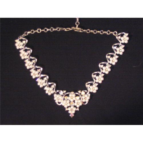 A 1950's evening necklace featuring an abundant pattern of flowering pearls and irridescent rhinestones pron-set in scrolling silvertone, hook clasp.