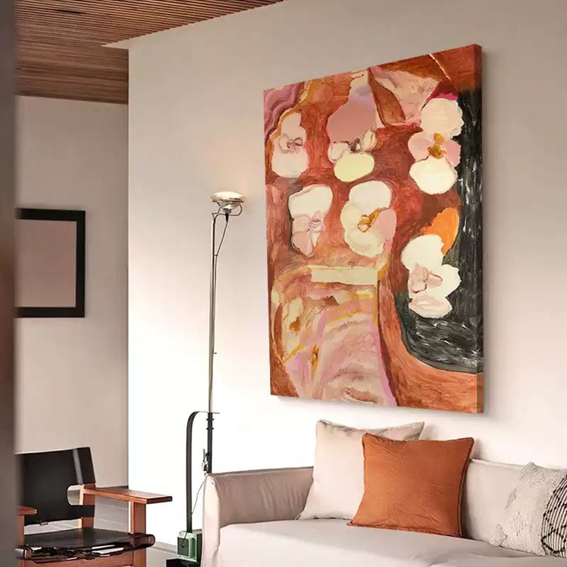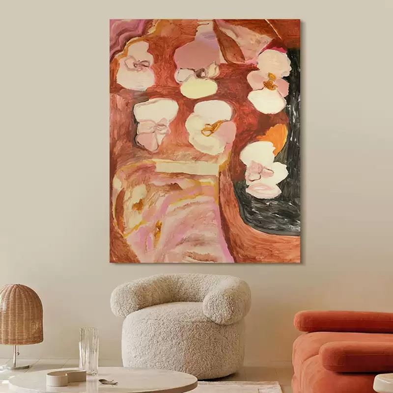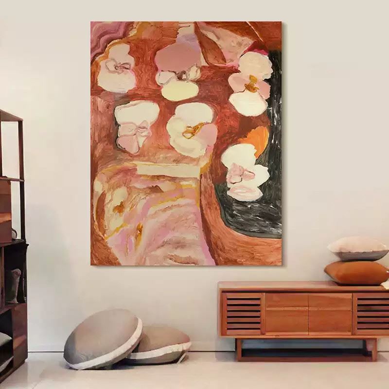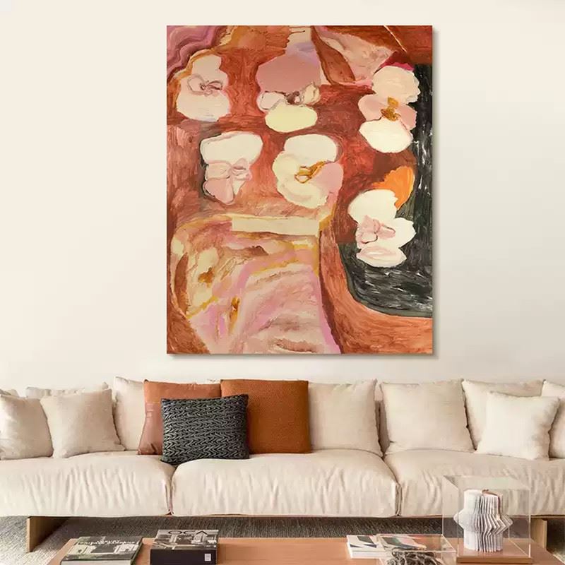 This artwork uses warm tones and soft brushstrokes to depict blooming flowers, capturing the gentle essence of nature. The fusion of pinks and oranges conveys a vibrant vitality, evoking the warmth and tranquility of flowers in full bloom. Dimensions: 24 x 31 inches.