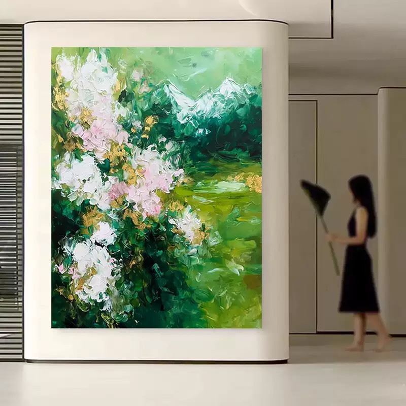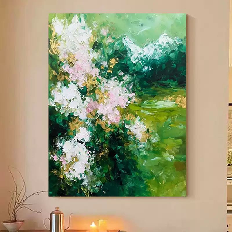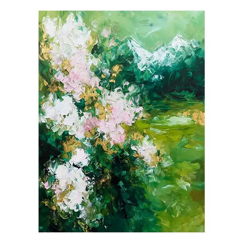 In this painting, a lush green valley intertwines with clusters of blooming flowers. Soft pink and white blossoms burst forth amid the rich greenery like an unexpected arrival of spring, filling the valley with vivid life. Dimensions: 24 x 31 inches.