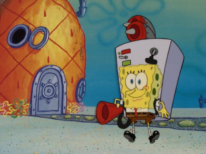 This animation cel and reproduction background are from the Nickelodeon TV show SpongeBob Squarepants. The story takes place under the deep blue sea in Bikini Bottom, where SpongeBob resides. SpongeBob, who is a yellow, porous sponge, is your typical happy-go-lucky character, as he is always cheerful and enjoys making people laugh. Patrick Star, SpongeBob's neighbor who is a starfish, is your average children's show idiot, as he boasts knowing nothing and is often getting himself into ridiculous situations. Between the homes of these two lies the home of the miserable Squidward, a squid, who is known for being grouchy and playing tricks on SpongeBob and Patrick. Both SpongeBob and Squidward work at the Krusty Krab, a fast food business run by the greedy money-loving Mr. Krabs, a crab, the arch rival of the evil, possibly misunderstood, Plankton. Another neighbor, Sandy Cheeks, an athletic squirrel who normally wears an astronaut's space suit, was introduced in "Tea at the Treedome." She spends most of her time inventing and experimenting. SpongeBob is happy with his new reef blower.Original Printed Background and Animated Cel Overall Size of Background: 11" x 17" Overall Size of the Cel: 10 1/2" x 12 1/2" Very good condition This is an original hand-painted cel set-up used in the production of an episode of "SpongeBob SquarePants." Each one-of-a-kind set-up represents a slight change in position of the characters. When individually photographed and projected in rapid succession, the images appear to move.