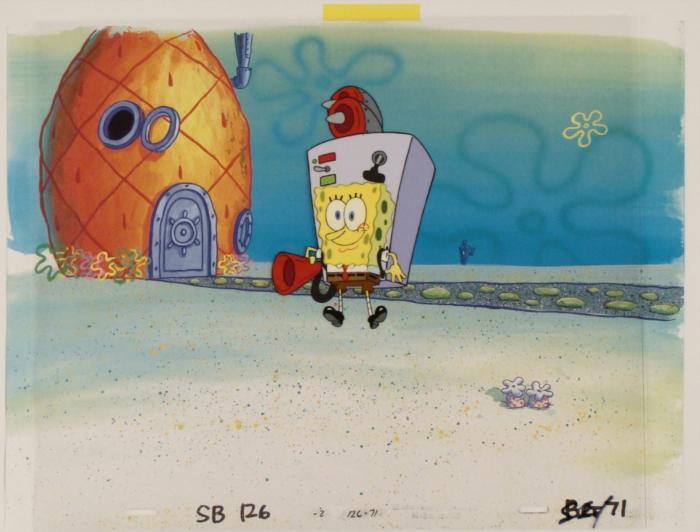 This animation cel and reproduction background are from the Nickelodeon TV show SpongeBob Squarepants. The story takes place under the deep blue sea in Bikini Bottom, where SpongeBob resides. SpongeBob, who is a yellow, porous sponge, is your typical happy-go-lucky character, as he is always cheerful and enjoys making people laugh. Patrick Star, SpongeBob's neighbor who is a starfish, is your average children's show idiot, as he boasts knowing nothing and is often getting himself into ridiculous situations. Between the homes of these two lies the home of the miserable Squidward, a squid, who is known for being grouchy and playing tricks on SpongeBob and Patrick. Both SpongeBob and Squidward work at the Krusty Krab, a fast food business run by the greedy money-loving Mr. Krabs, a crab, the arch rival of the evil, possibly misunderstood, Plankton. Another neighbor, Sandy Cheeks, an athletic squirrel who normally wears an astronaut's space suit, was introduced in "Tea at the Treedome." She spends most of her time inventing and experimenting. SpongeBob is happy with his new reef blower.Original Printed Background and Animated Cel Overall Size of Background: 11" x 17" Overall Size of the Cel: 10 1/2" x 12 1/2" Very good condition This is an original hand-painted cel set-up used in the production of an episode of "SpongeBob SquarePants." Each one-of-a-kind set-up represents a slight change in position of the characters. When individually photographed and projected in rapid succession, the images appear to move.