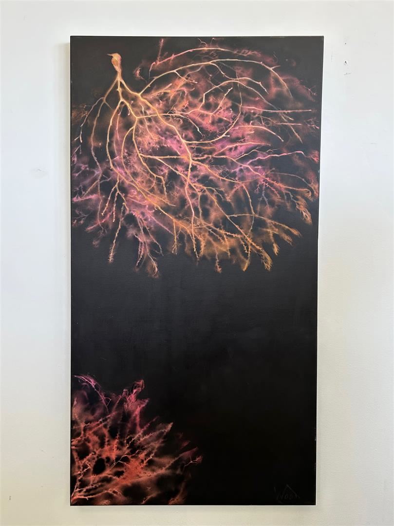 A luminescent impression of tumbleweed on a black background. 45x24" Original acrylic on stretched canvas by Marion Wood. COA.