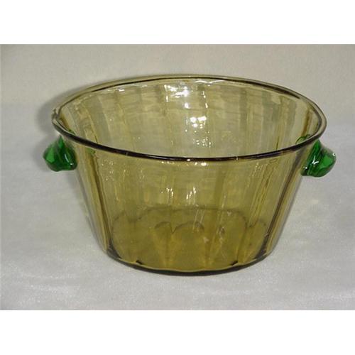 Ribbed amber colored blown glass bowl. 7 3/4" in diameter x 4 " tall with applied green glass handles. Polished pontal.