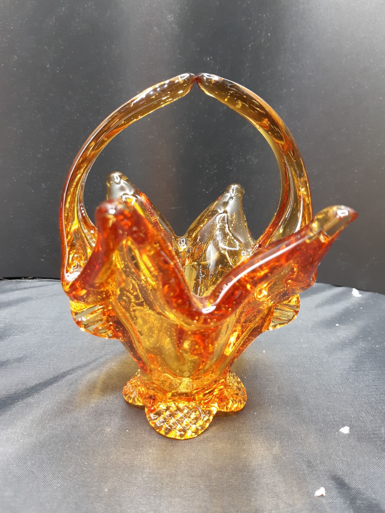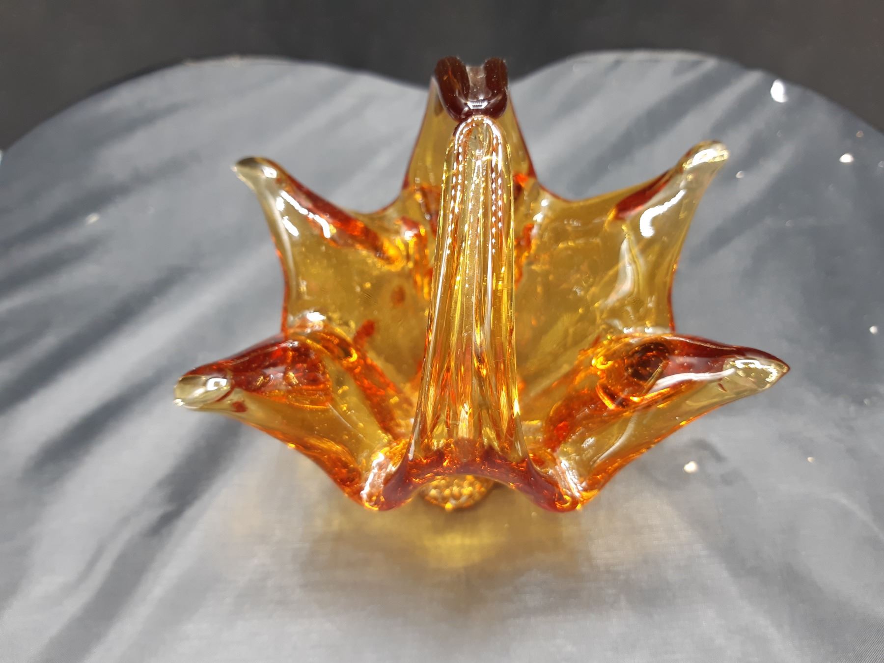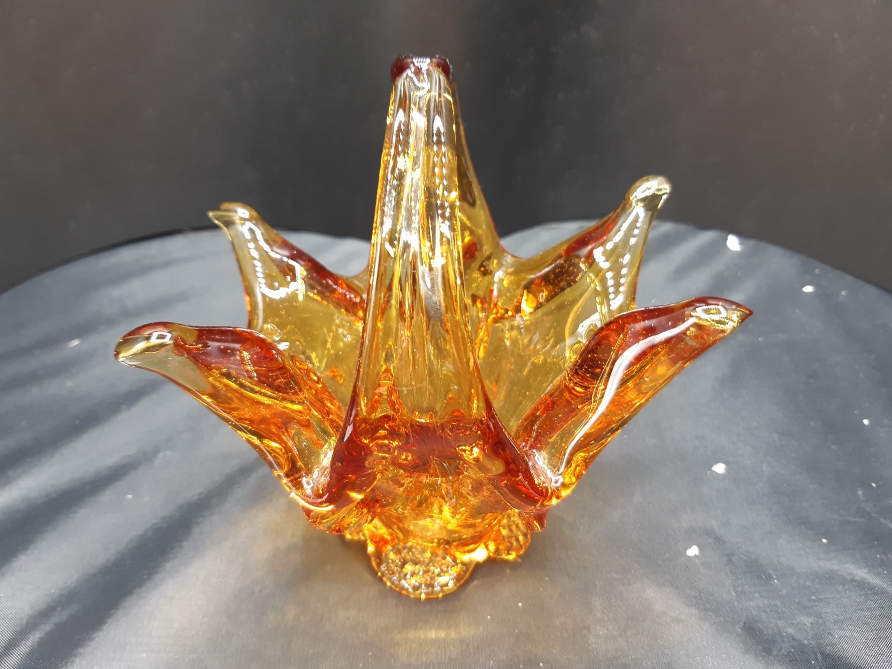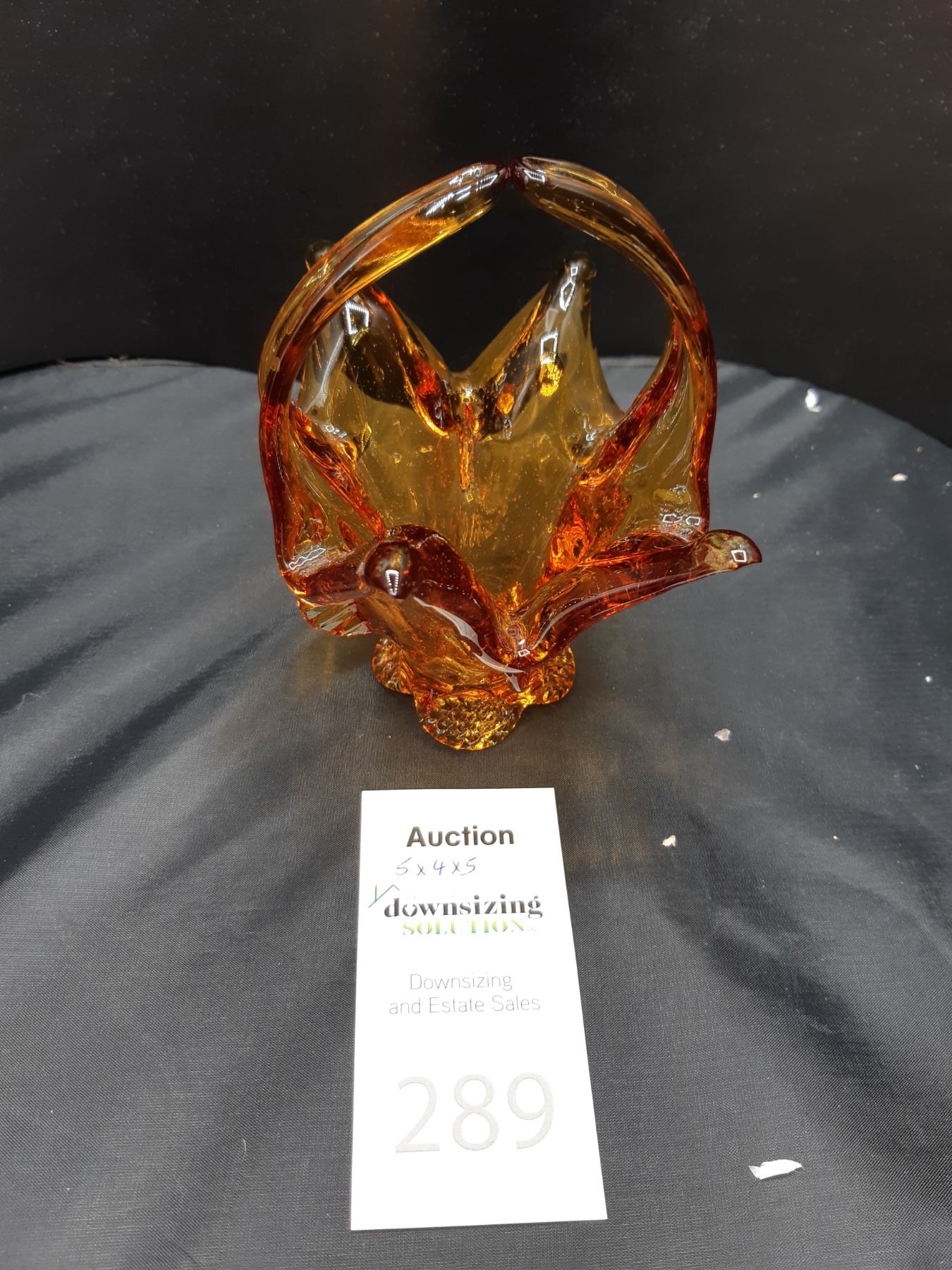 Blown glass amber dish where handles meet in the middle, 5x4x5 Pickup at 9am