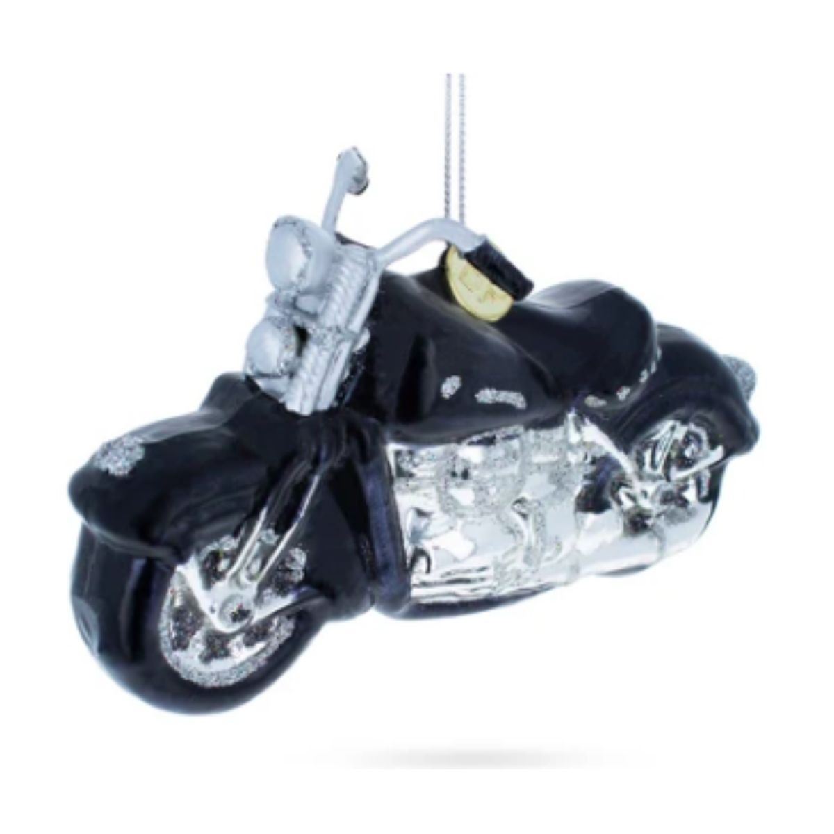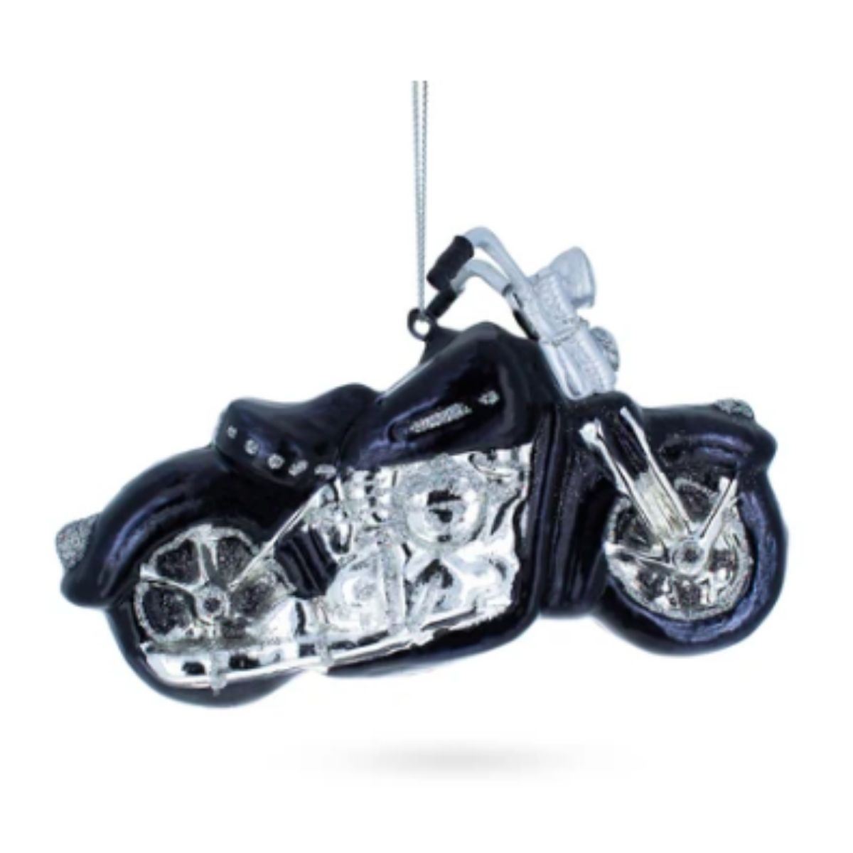 Mouth blown, hand-painted glass, black & white motorcycle ornament with applied glitter. 5 1/4" X 2" X 3 3/4". Â